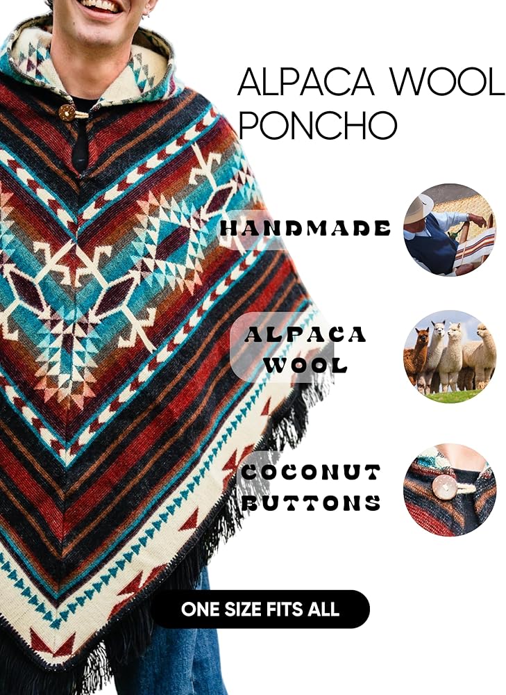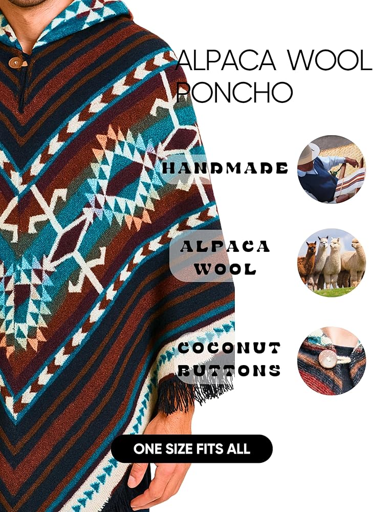 【 ONE SIZE COWBOY STYLE 】 Alpaca Mens Poncho with Hood fits most (S–XXL). Features a roomy hood, elegant drape, and real coconut buttons for a timeless cowboy-inspired look.