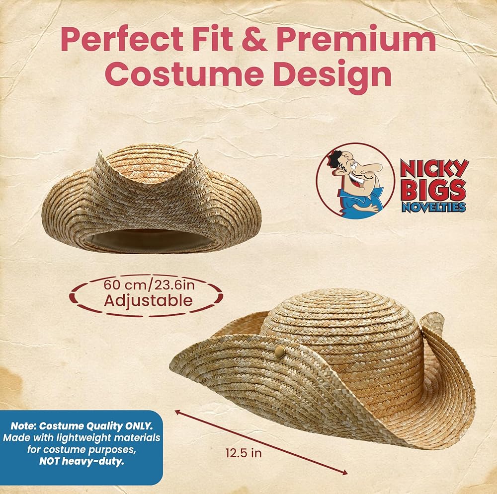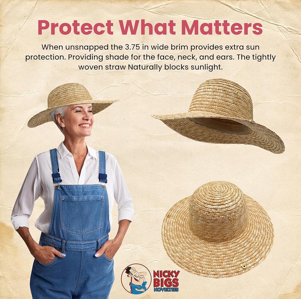 Step back in time or step out into the sun with the Nicky Bigs Novelties Adult Straw Tricorn Hat, a versatile and functional hat designed for historical reenactments, cosplay, costumes, gardening, and outdoor work. This adjustable hat features snap-up sides, allowing you to switch between a classic three-cornered shape and a wide-brim straw hat for added SPF sun protection.