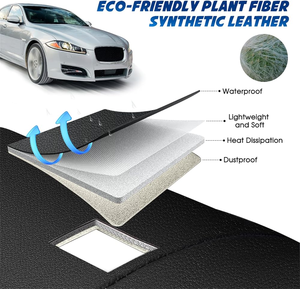 Premium Material: Crafted from eco-friendly synthetic leather made from plant fibers, this dash mat dashboard cover outperforms standard fabric mats. It elevates your dashboard's aesthetic, is resistant to water, dust, and stains, and is easy to clean. With a thickness of just 0.12 inches, it's lightweight, breathable, and fits snugly without bulk.