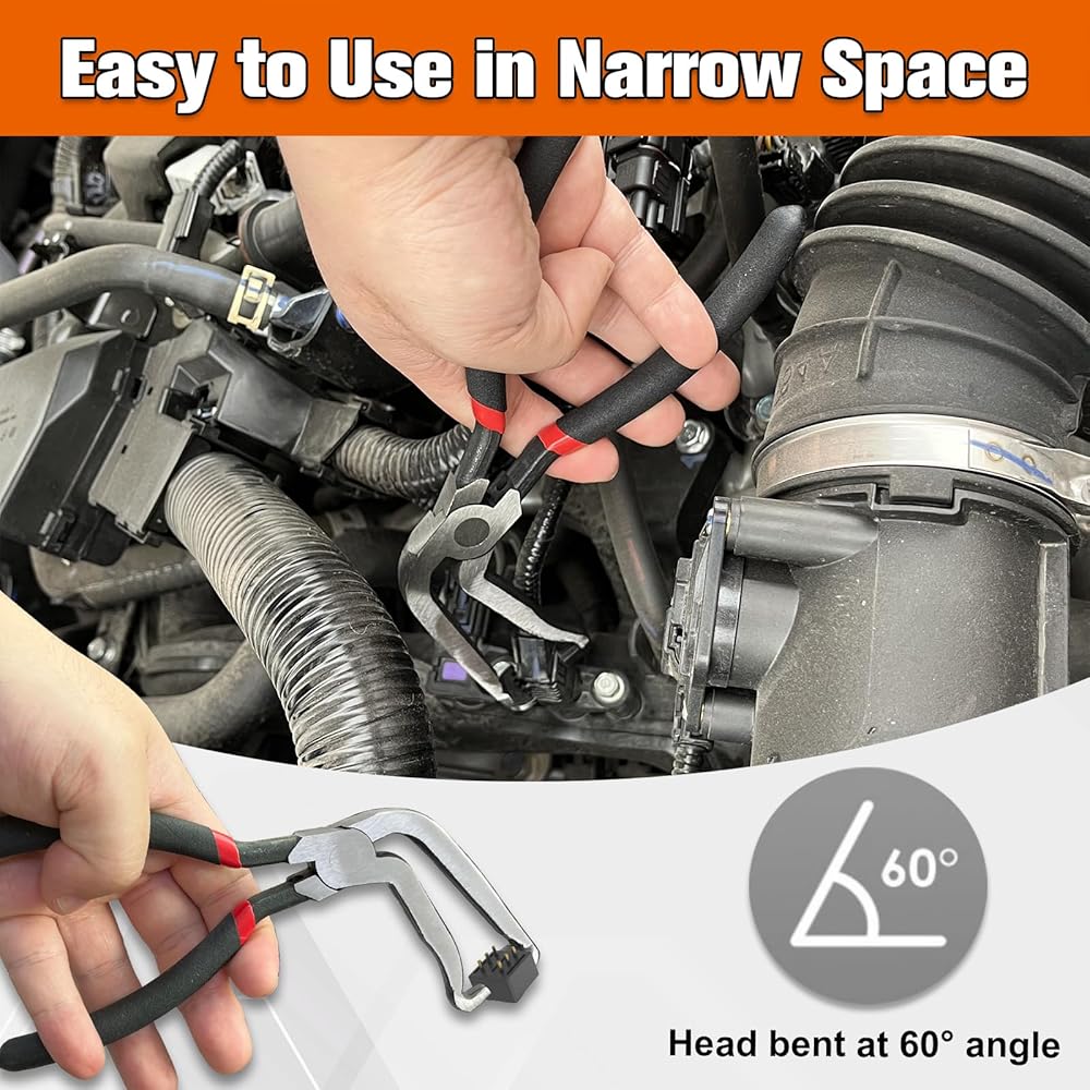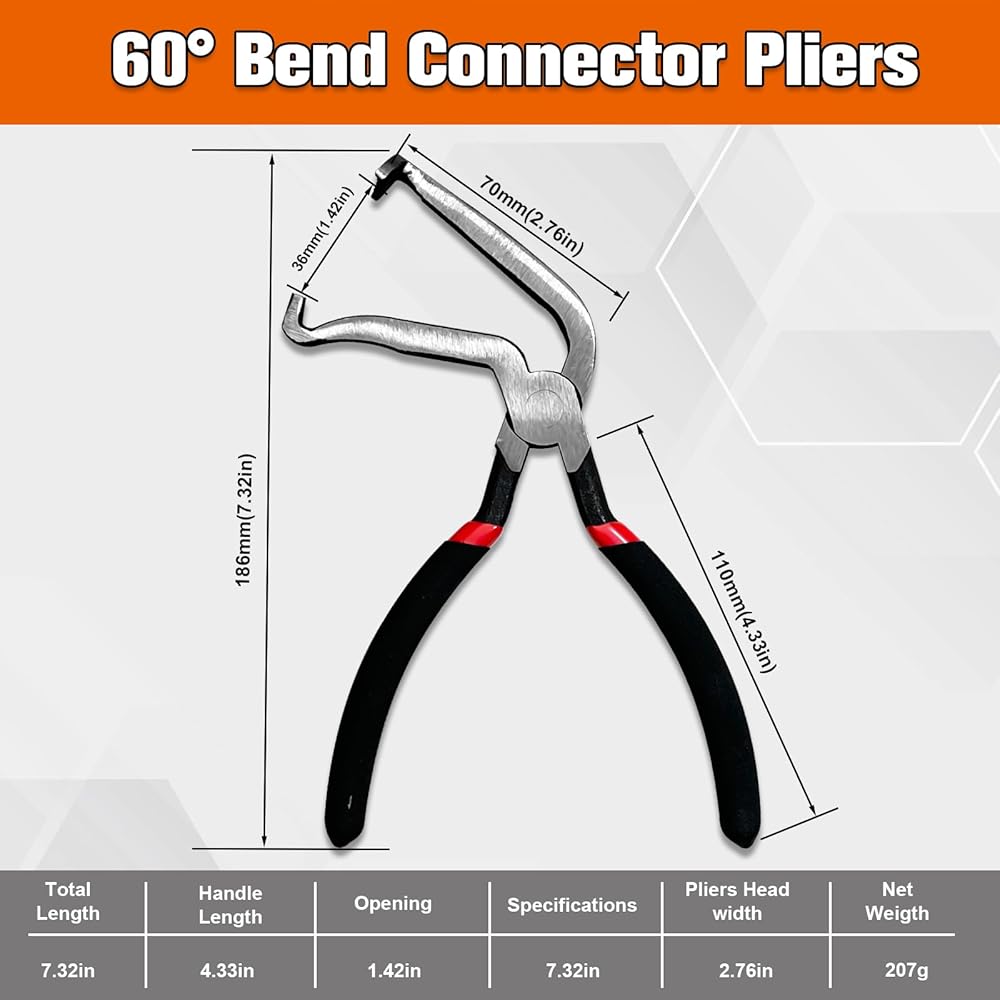 【Easy to Operate】: The automotive electrical connector pliers are 8 inches in total length, compact and portable, and can be easily put into your tool box or car kit. When using, first use the hook at the end of the pliers to pull out the tab to unlock. Then grab the tab and squeeze. Finally, pull hard to separate the connector from the sensor.