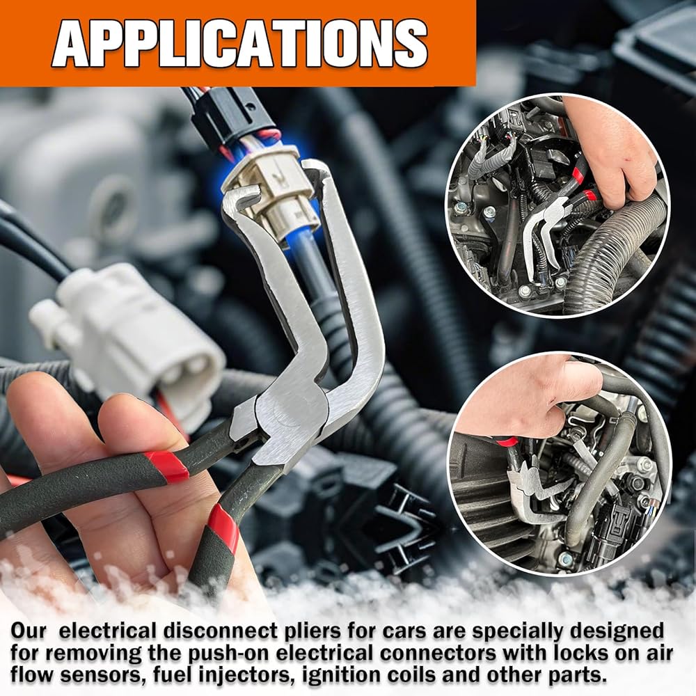 【Widely Used】: Our automotive electrical connector pliers are specially designed for removing the push-on electrical connectors with locks on air flow sensors, fuel injectors, ignition coils and other parts. Suitable for all kinds of push-on electrical connectors with locks. It is also widely used in electrical installation and maintenance work in the fields of industry, power, communication, etc. It is an indispensable professional tool in your toolbox.