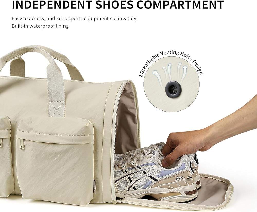 【Smart Compartment Storage】Our gym duffel bag features a dedicated anti-odor shoe compartment with ventilation system to keep the interior clean and fresh. The main compartment can fit a weightlifting belt, 3 sets of training clothes, and a 1.5L water bottle. Additionally, it includes 2 external quick-access pockets and a hidden anti-theft back pocket. Stay organized and secure, whether you're hitting the gym or on the go!