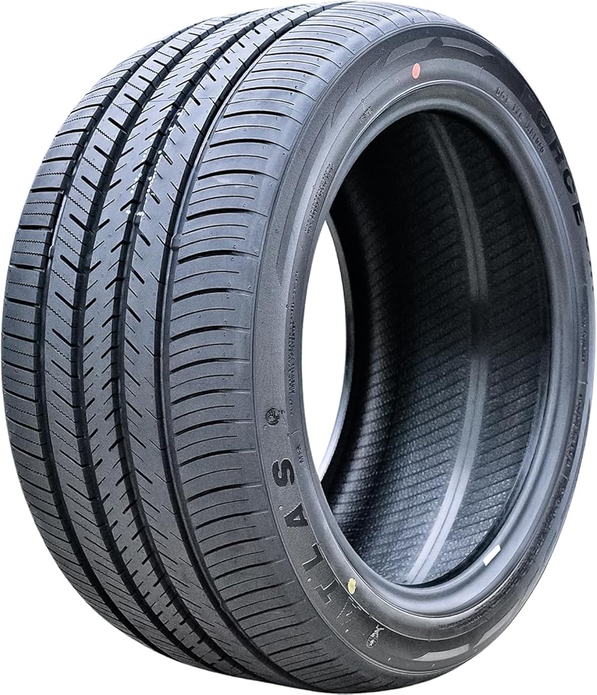 Dual-zone tread pattern with wet-weather traction pattern at center and dry-weather design at edges allows for consistent performance in wet and dry conditions
