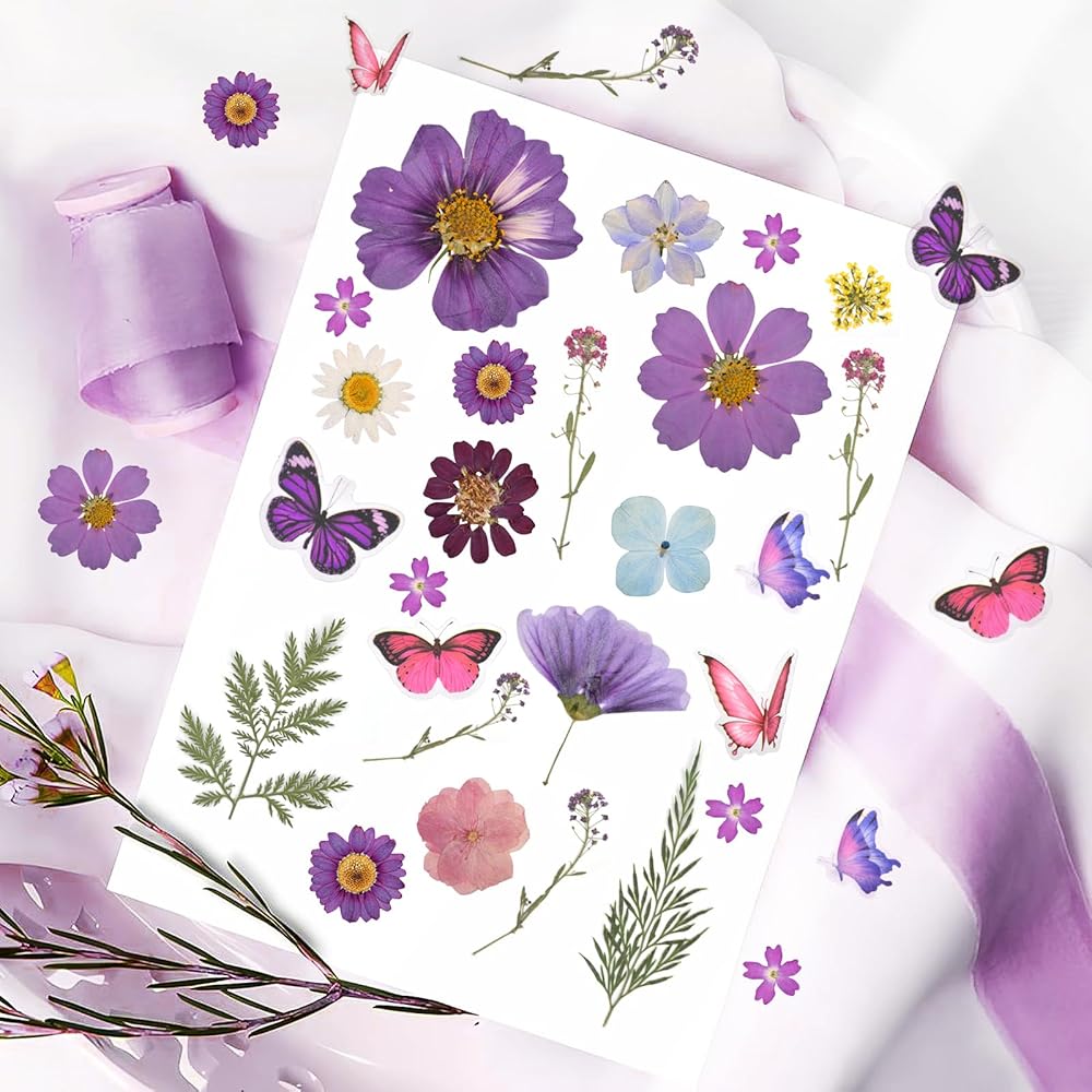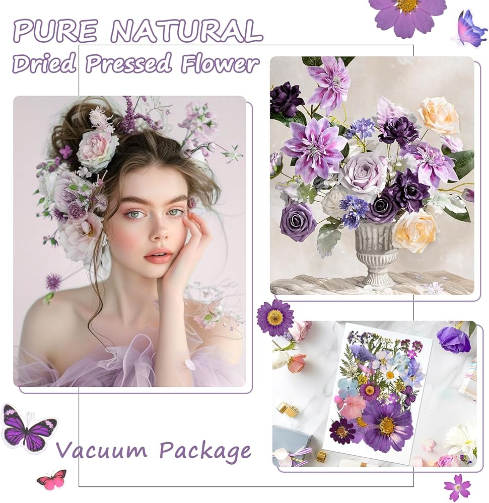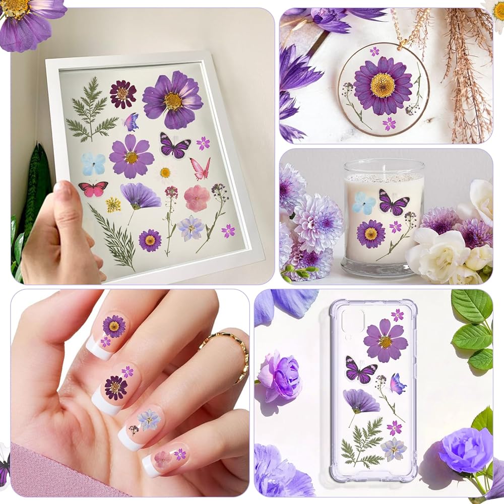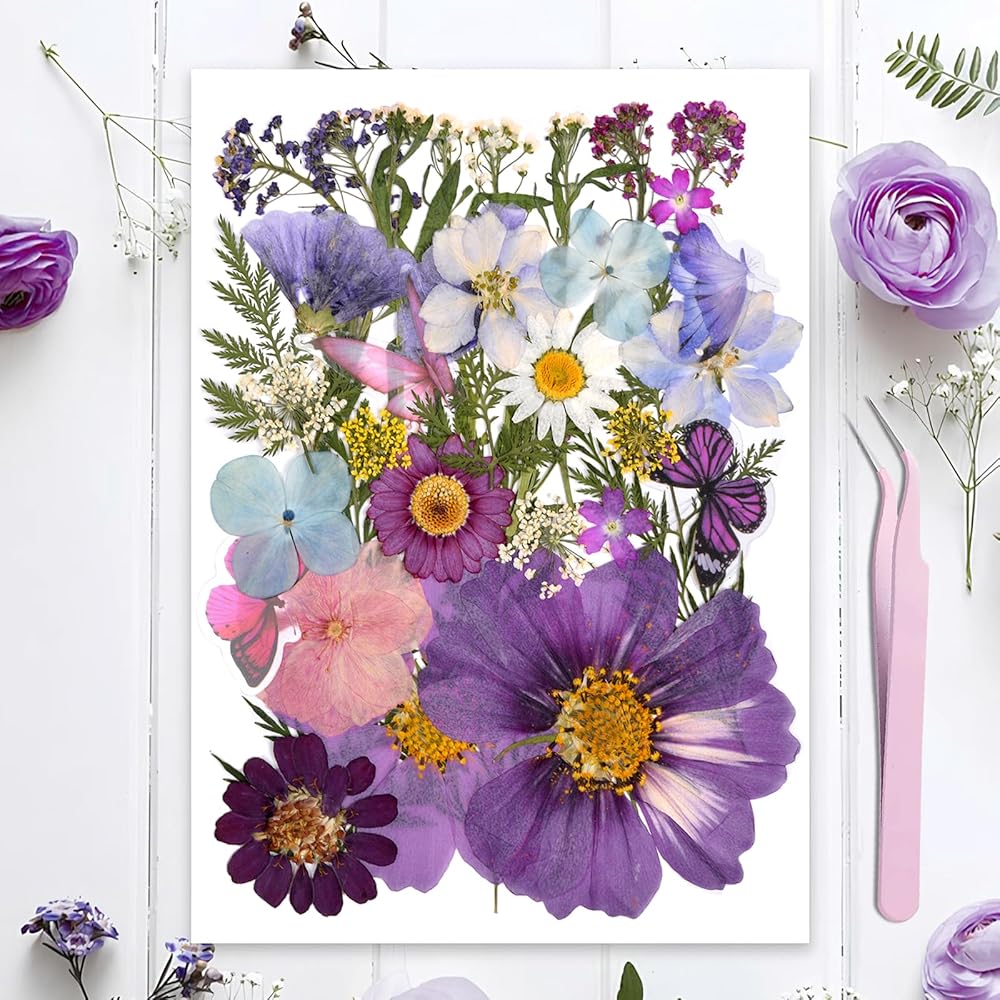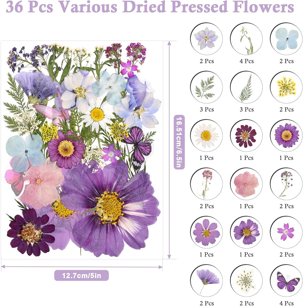 Yuboo 36Pcs Spring Purple Dried Pressed Flowers for Craft, Spring Gifts Pressed Florals with Tweezer, Flowers for Resin Molds DIY Scrapbooking Candle Nails Decor Phone Case Frame Card