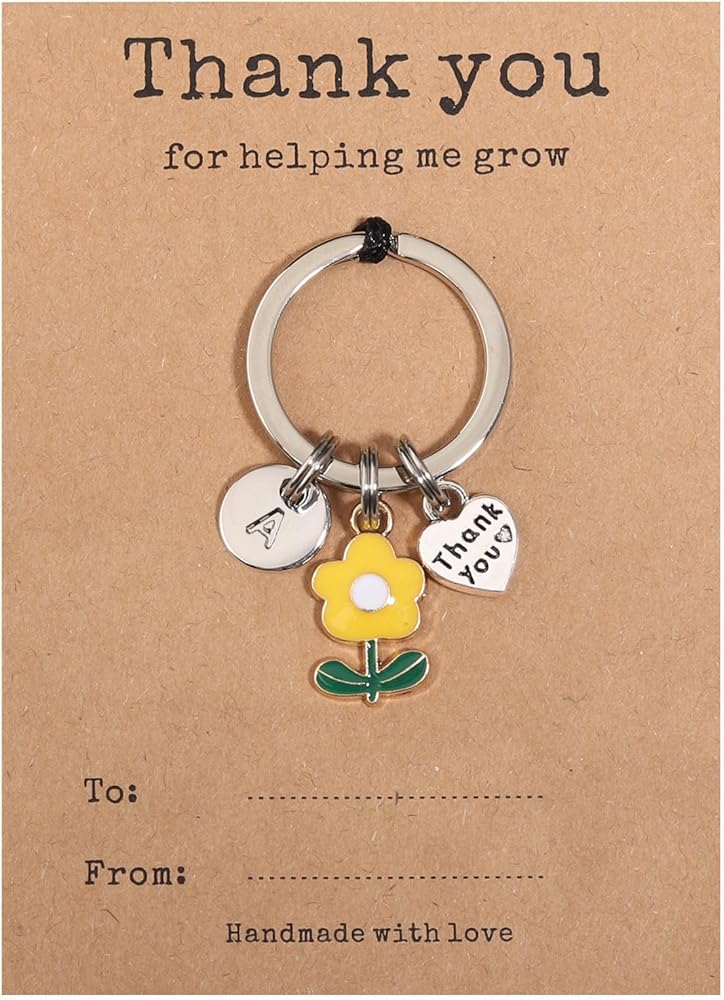 Meaningful Gifts:This initial keychain has a beautiful look as well as packaging, and the card inside says Thank you for helping me grow. You can give it as a gift to your teacher on Thanksgiving, Christmas, teacher's birthday, back to school, leaving school, teacher appreciation week.