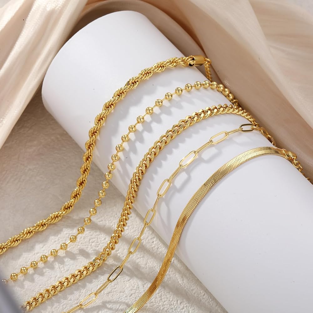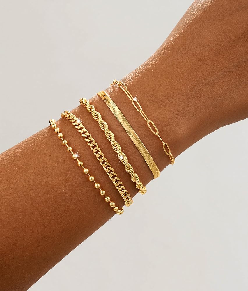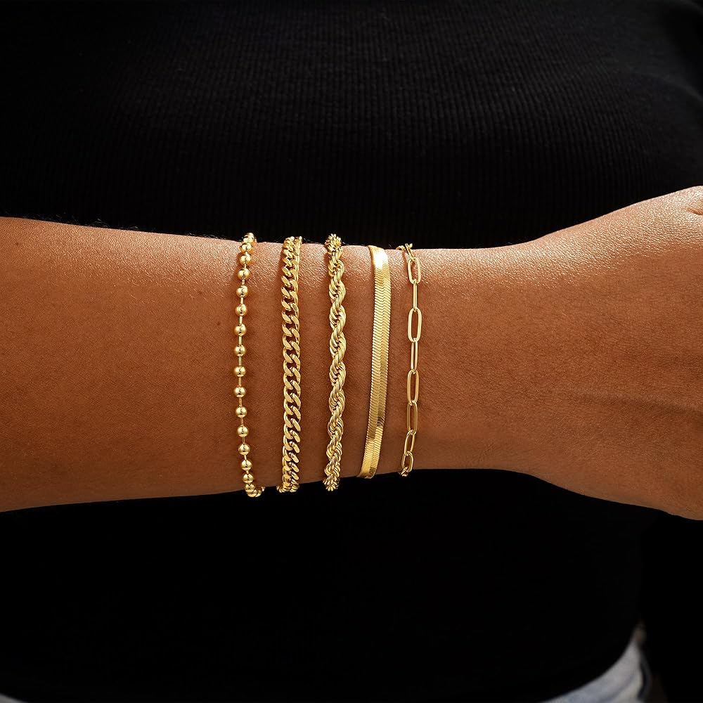 CAROVO Gold Bracelets for Women Waterproof Dainty 14K Gold/Silver Plated Stackable Cuban Beaded Link Snake Lip Paperclip Cuban Rope Chain Bracelets Fashion Jewelry Gift for Women