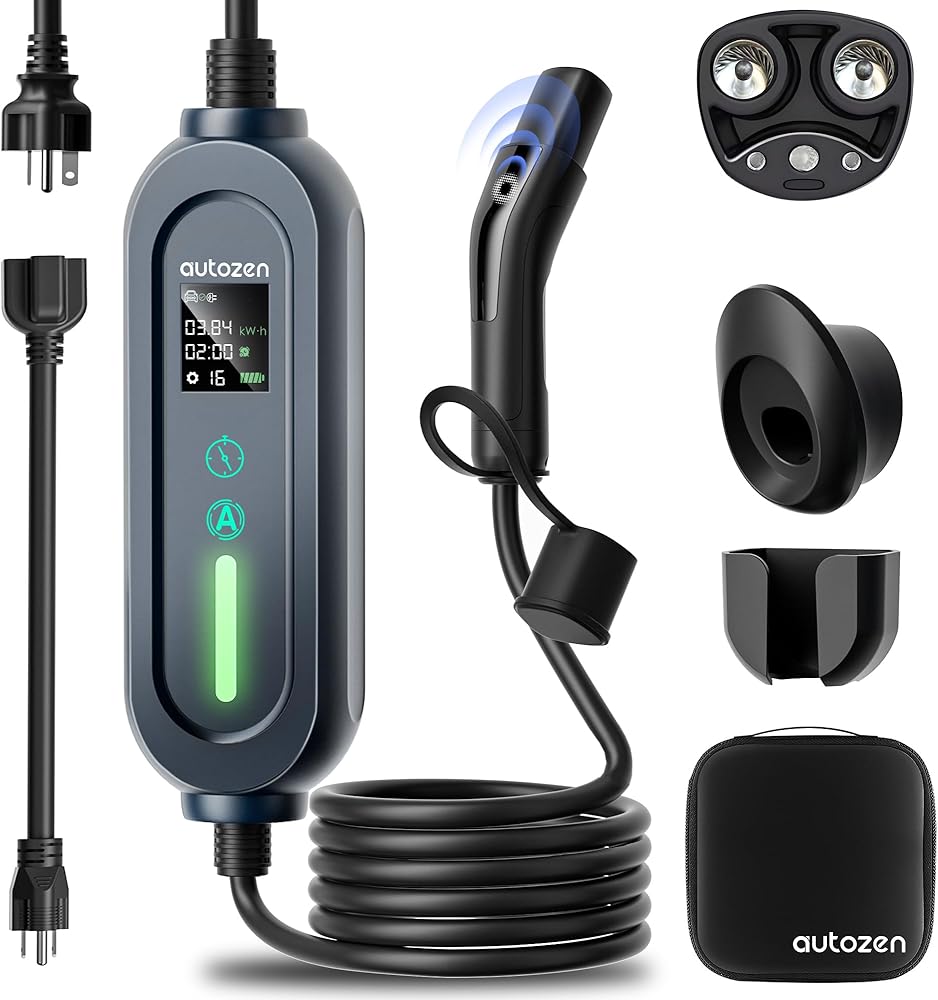 Level 1+2 EV Charger for Tesla: autozen Tesla mobile charger offers the perfect charging solution for your Tesla vehicles. Equipped with a NEMA 6-20 plug for faster Level 2 charging (240V 16A 3.84kW, 13 miles/hr) and a NEMA 5-15 adapter for convenient Level 1 charging (120V, 16A, 1.92kW, 8 miles/hr), provides the flexibility to charge at home or on the go. Engineered with the North American Charging Standard (NACS) connector, it ensures seamless compatibility with Tesla Model Y, 3, S, X, Cybertruck, and other NACS-compliant electric vehicles
