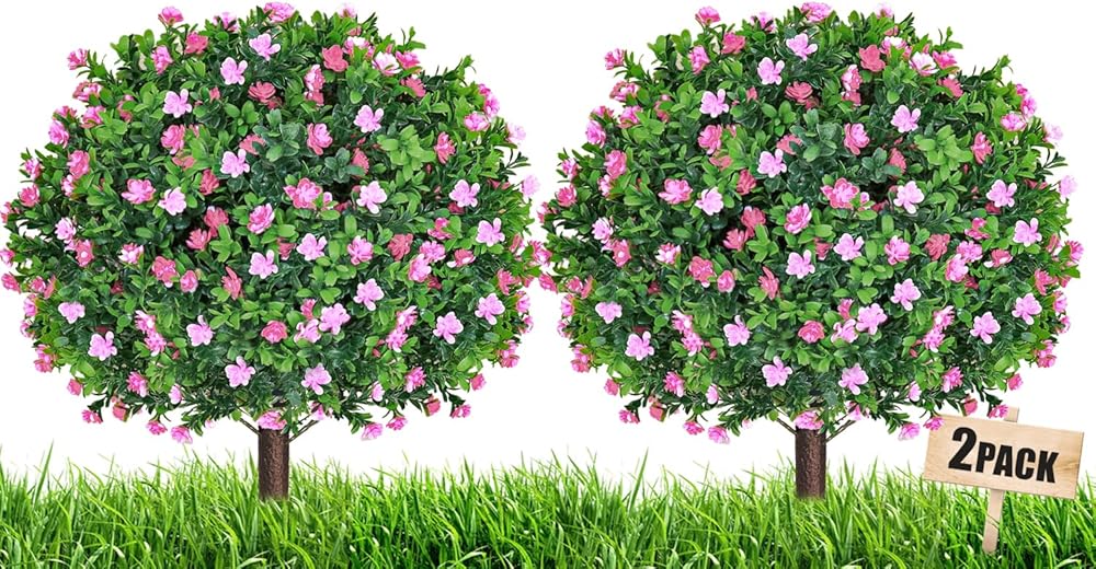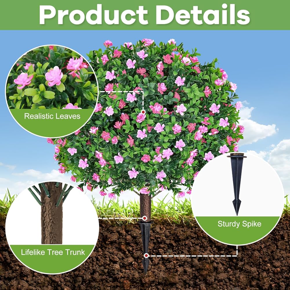 Set of 2 Artificial Boxwood Topiary Ball Trees with Pink Flowers Fake Bushes Plants Outdoor Boxwood Ball with Ground Spike 25.5 Inch UV Resistant Faux Greenery Shrubs for Porch Garden Decor