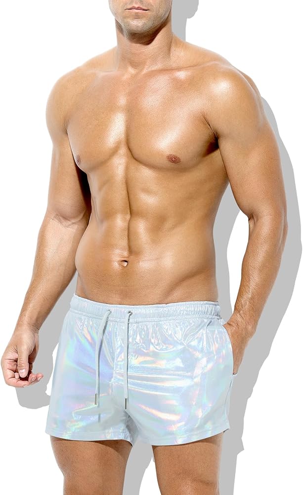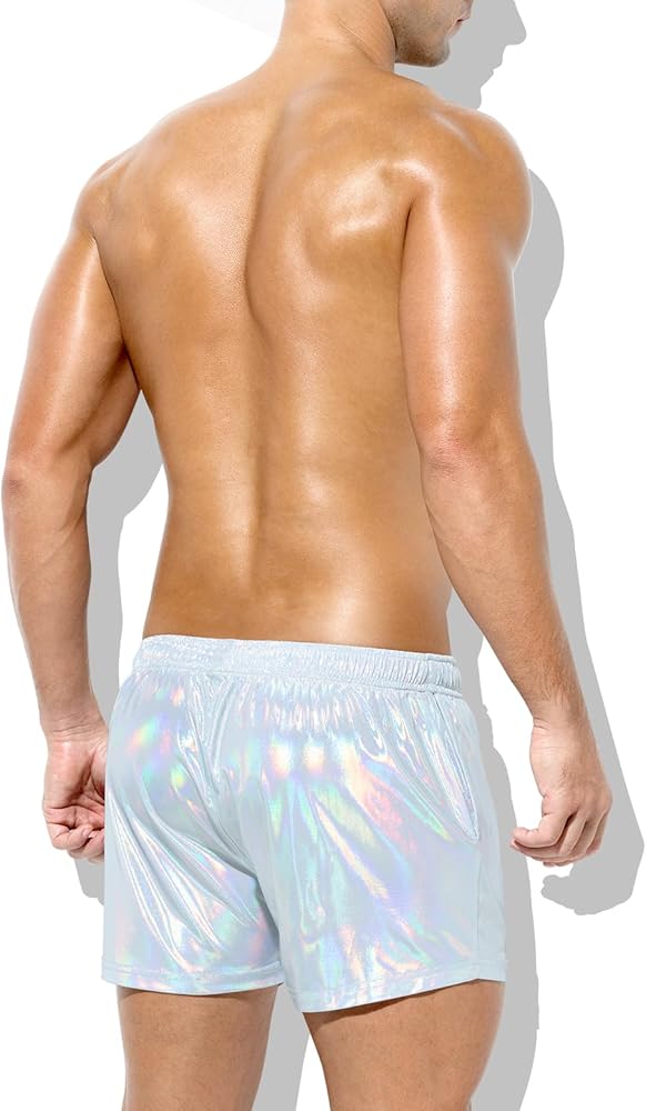 Mens Holographic Metallic Shorts with Pockets and Drawstrings made in stretch and breathable fabric.