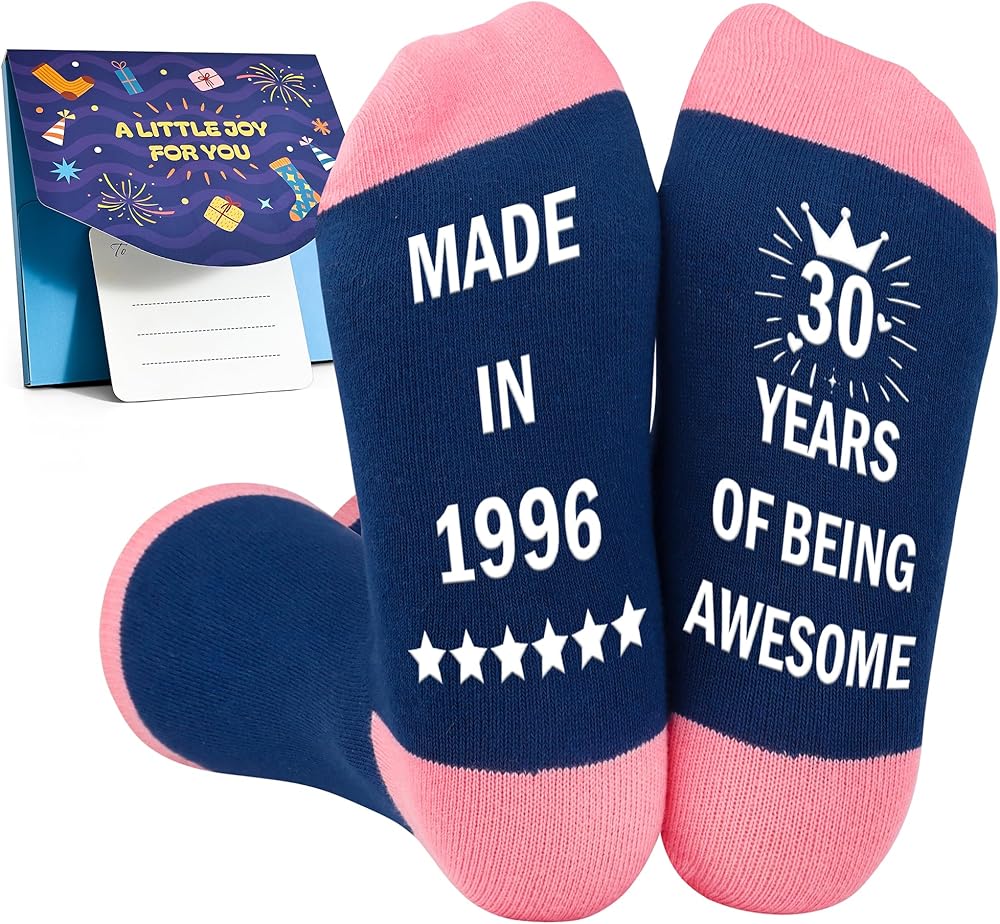 30th Birthday Socks: "MADE IN 1995,30 YEARS OF BEING AWESOME". Interesting words printed on the bottom of the socks, and the words are non-slip.
