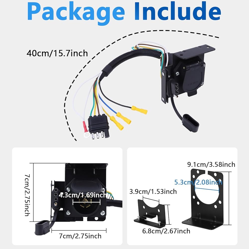 Package include : 4 way to 7 way trailer plug adapter,1 mounting bracket,6 screws,and 6 nuts