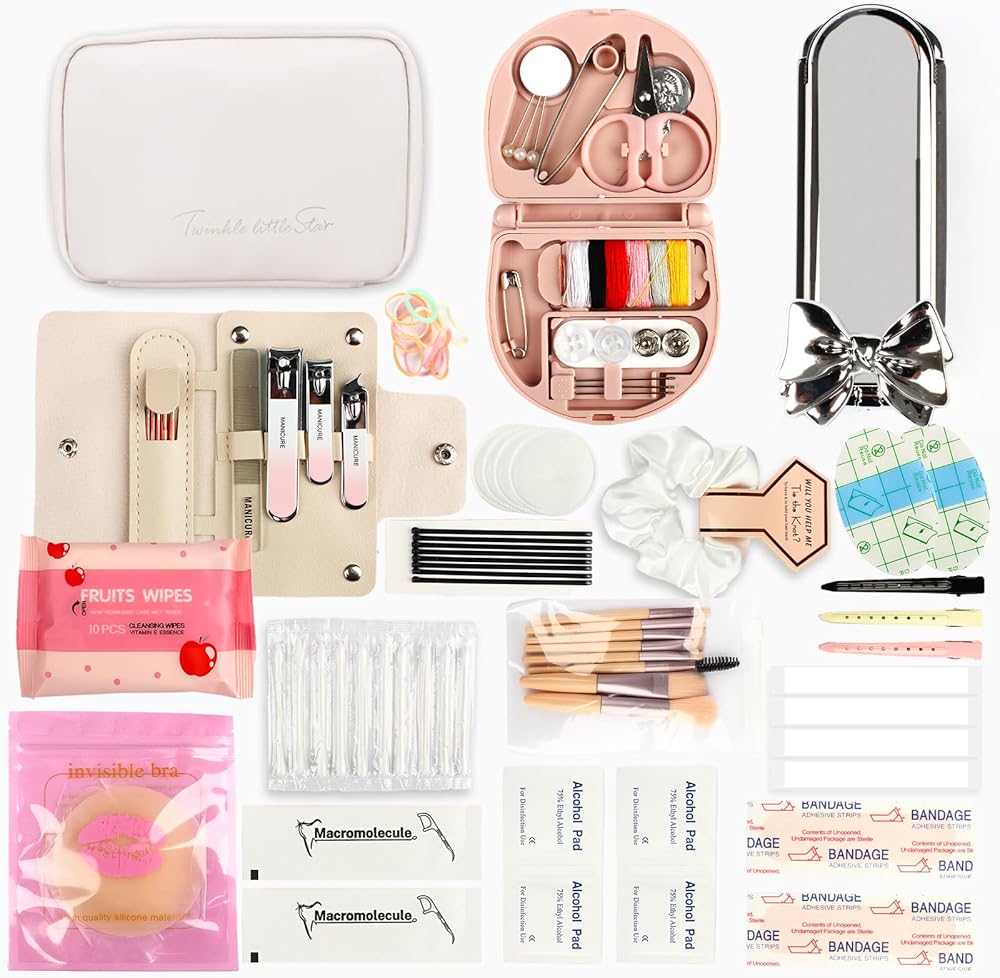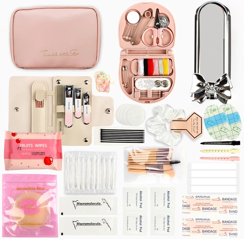 HAIRBRUSH,MAKEUP BRUSH SET HAIR TIE AND SEWING KIT:The emergency kit comes with a silver retractable hair brush, it has a removable mirror and contains a satin hair tie. and multiple clear and black headbands. There are also 3 multi-color hairpins, 10 black thin hairpins, and the sewing kit has safety pins, sewing needles, 6 colors of thread, scissors, buttons, safety pins, and more. Finally you will also have a set of makeup brushes.