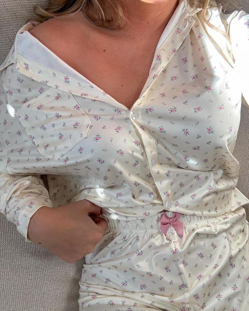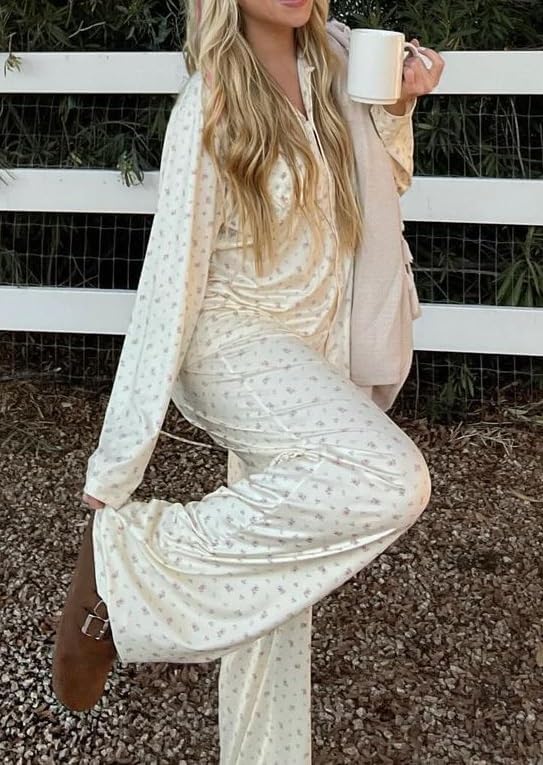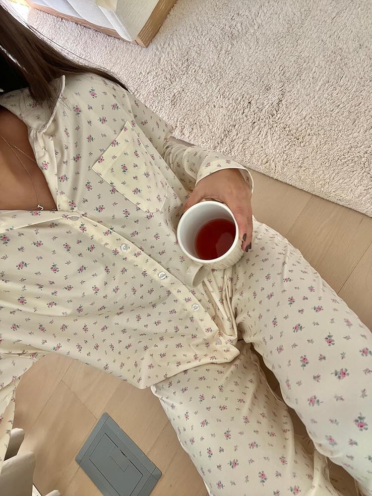 Design: Women pajamas set,Flower patterns, long sleeve tops with turn-down collar, buttons down design, breast pocket. The long pants feature an elastic waist, wide leg, loose fit pjs pants