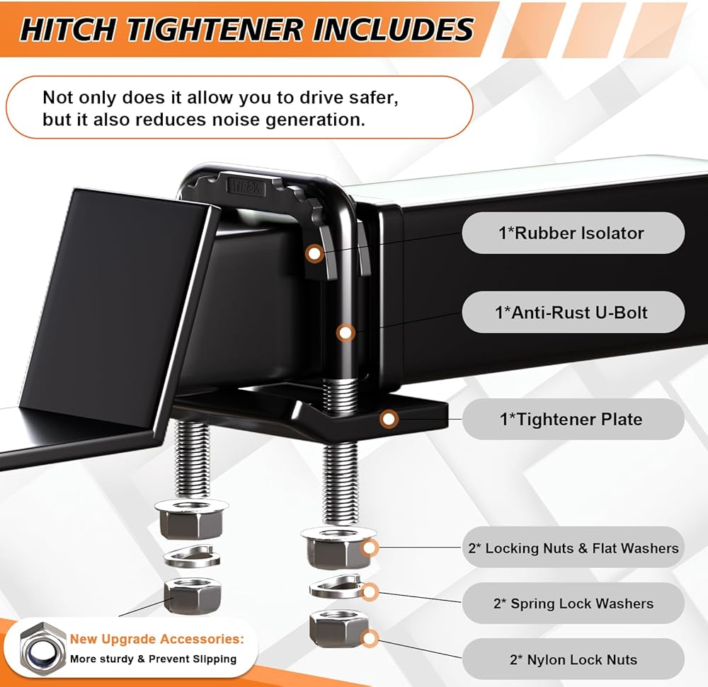 NEWLY UPGRADED HITCH TIGHTENER: Rubber isolation design, double protection, reduce friction with the receiver. The upgraded hitch tightener anti-rattle clamp includes: high strength anti-rust u-bolts, rubber vibration isolator, tightener plate, 2 spring lock washers, 2 locking nuts & flat washers and 2 nylon lock nuts, all of which parts are carefully galvanized and powder-coated for long-lasting durability.