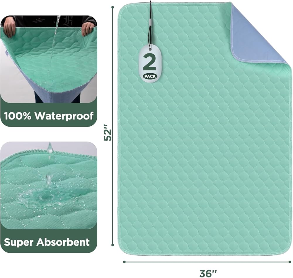 Hide Stains Bed Pads Washable Waterproof for Incontinence, 4-Layer Absorbency Pee Pads, Washable Underpad, Bed Wetting Pad for Elderly, Adults, Pets, 36"x52"-2 Pack, Green