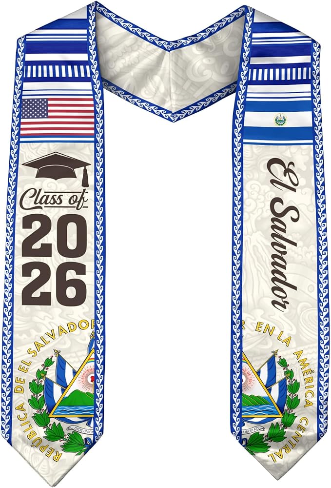 Our graduation sash class of 2024 is printed with El Salvador and American flags, echoing the theme of the international graduation season, which celebrates graduation for you, making your graduation even more memorable & meaningful