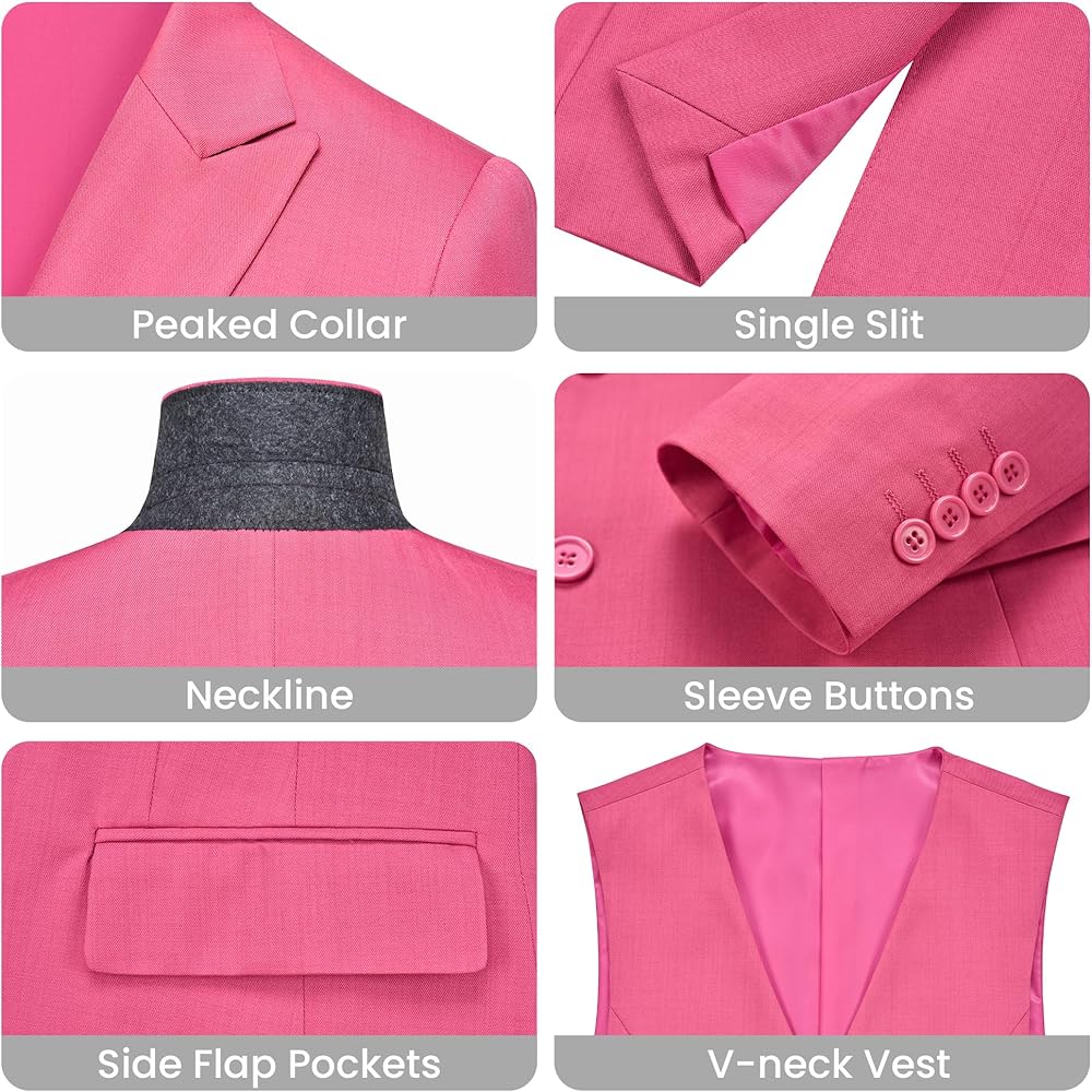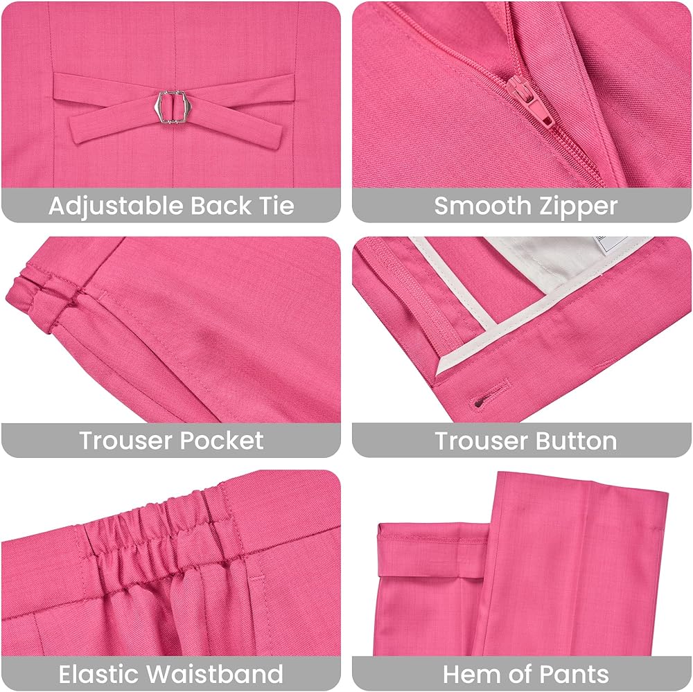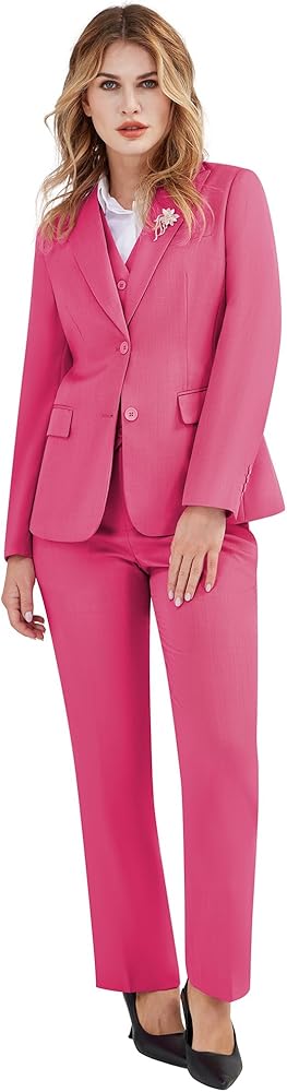 Fashion Style: Women's Blazer: Solid color, peak lapels,2 buttons closure, single back vent, 2 flap pockets. Women's Vest: V-neck,4 buttons closure,two side pockets. Women's suit trousers: Straight front, zip fly, buttoned ends and elastic at the side waist, two front slash pockets