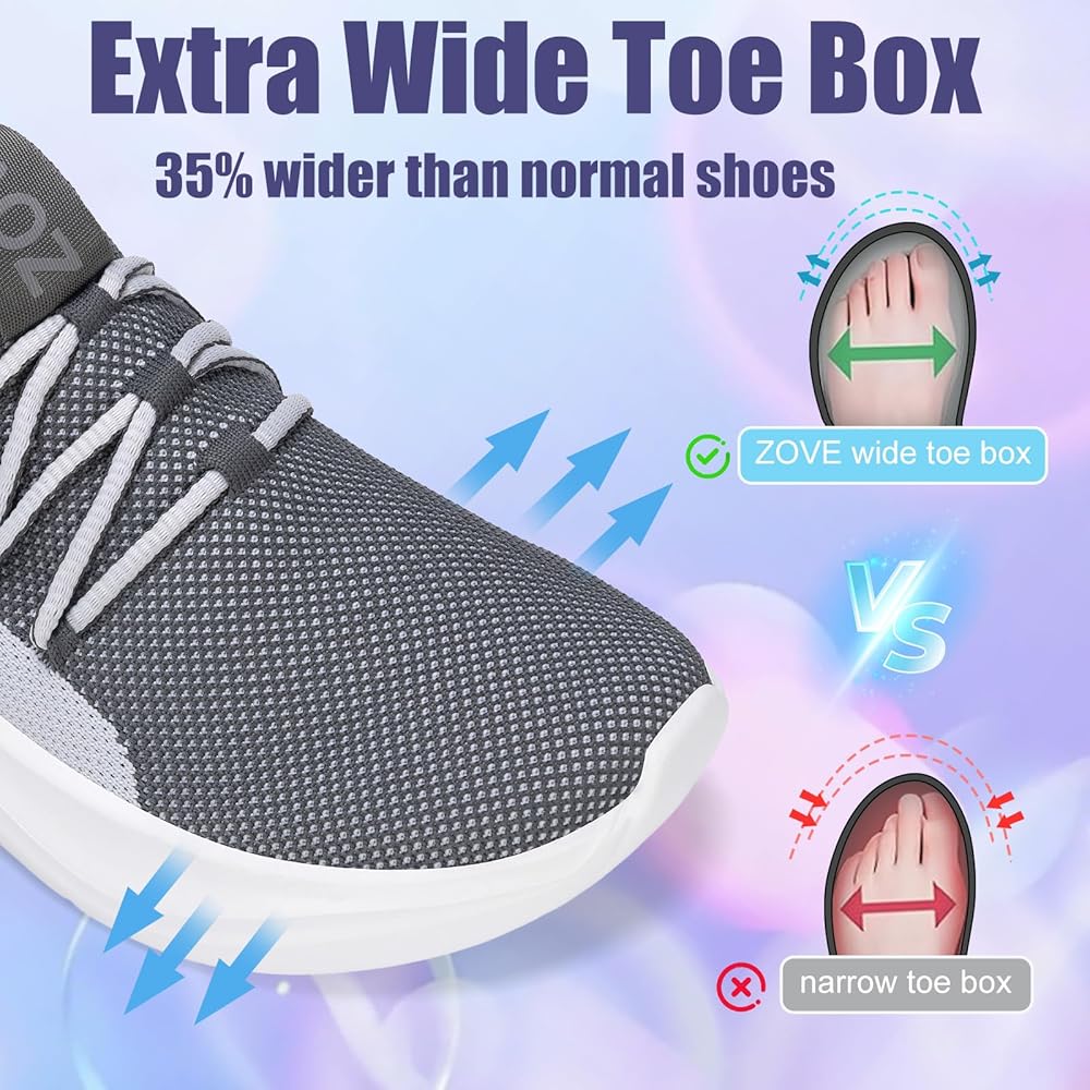 Wide Toe Friendly Design: ZOVE wide toe box shoes women are specially designed for women with wide feet, providing a more spacious and comfortable shoe interior space, allowing your feet to stretch freely during exercise.