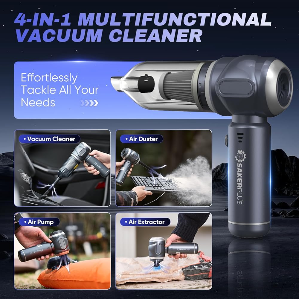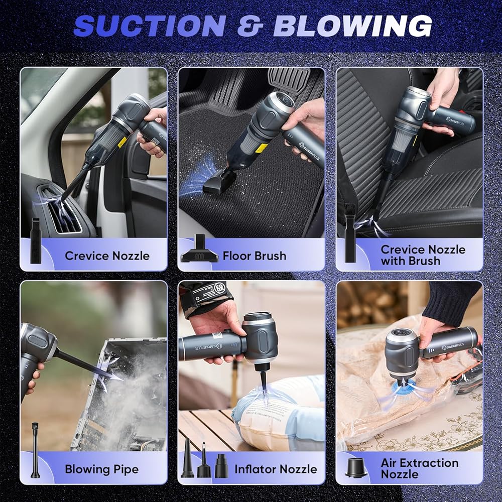 【VERSATILE 4-IN-1 FUNCTIONALITY】SakerPlus hand held vacuum cordless combines vacuuming, blowing, inflating, and deflating in one compact device. This portable vacuum for car includes a floor brush, air extraction nozzle, long flat suction, pipe blowing round brush, short blowing nozzle, long blowing pipe, flat suction brush, small inflator nozzle, and large inflator nozzle, making it ideal for cleaning tight spaces, car interiors, carpets, and inflating items like airbeds and swimming rings.