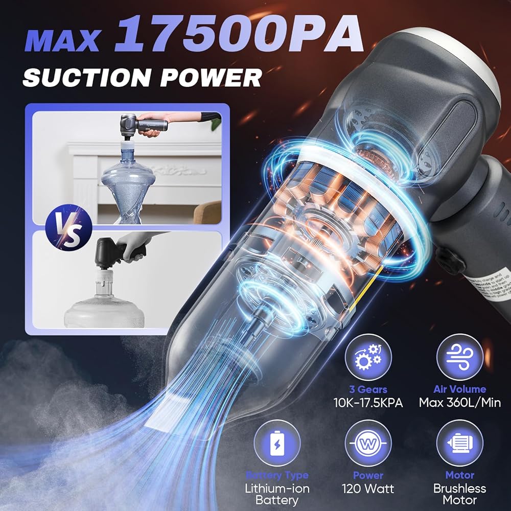 Car Vacuum Portable Cordless, 3-in-1 Hand Held Mini Vacuum Cleaner 17500PA High Power, Handheld Vacuum & Air Duster for Suction, Blowing, Inflating & Deflating, Ideal for Car Home Office