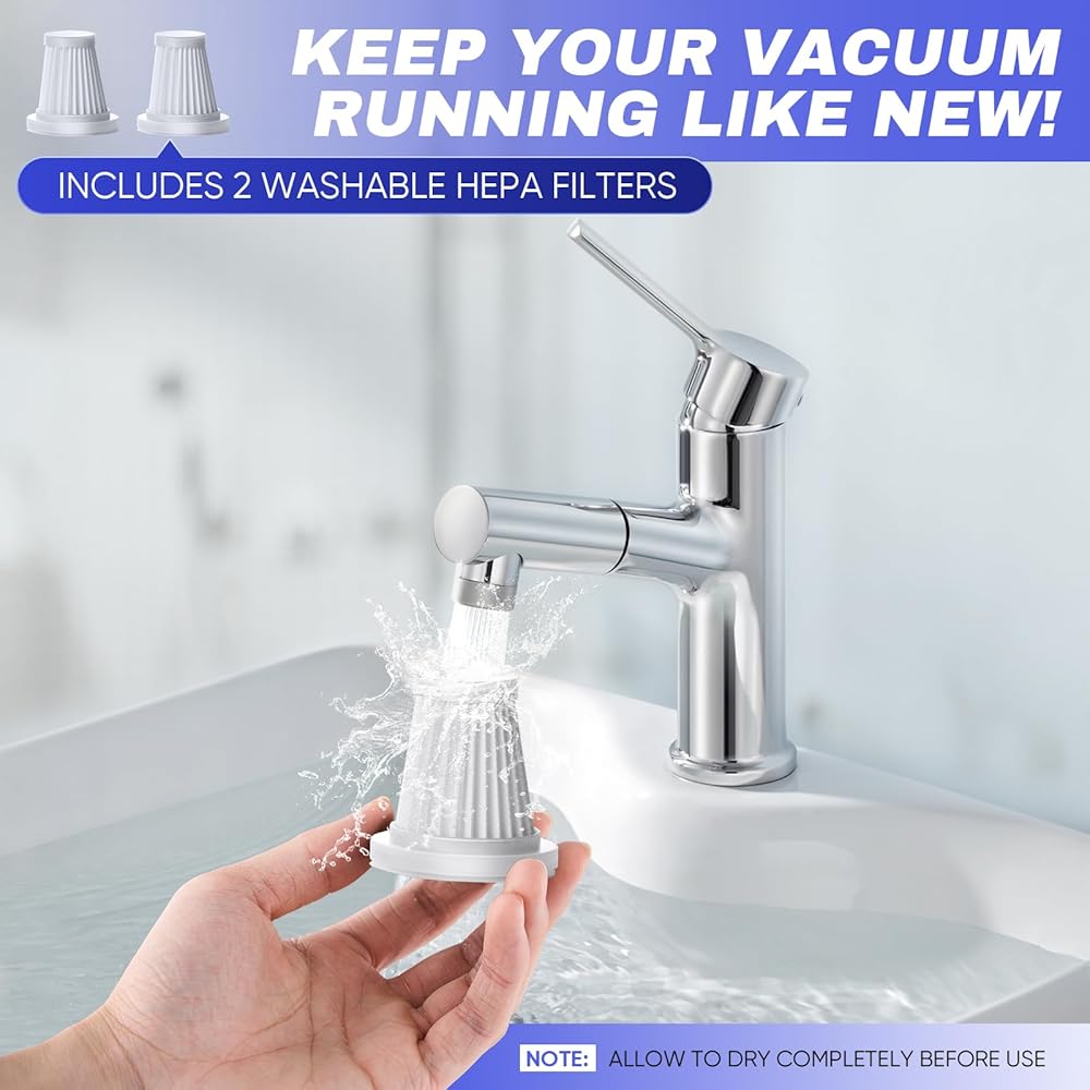【EFFICIENT HEPA FILTRATION SYSTEM】Equipped with a durable HEPA filter, sakerplus cordless vacuum cleaner for car captures fine particles and debris with ease, ensuring cleaner air during operation. The washable and reusable filter simplifies maintenance and enhances durability. Each vacuum set includes two HEPA filters with a lifespan of up to 10 washes before replacement, providing added convenience for replacements. The 200ml dust cup is sufficient for daily small-scale cleaning