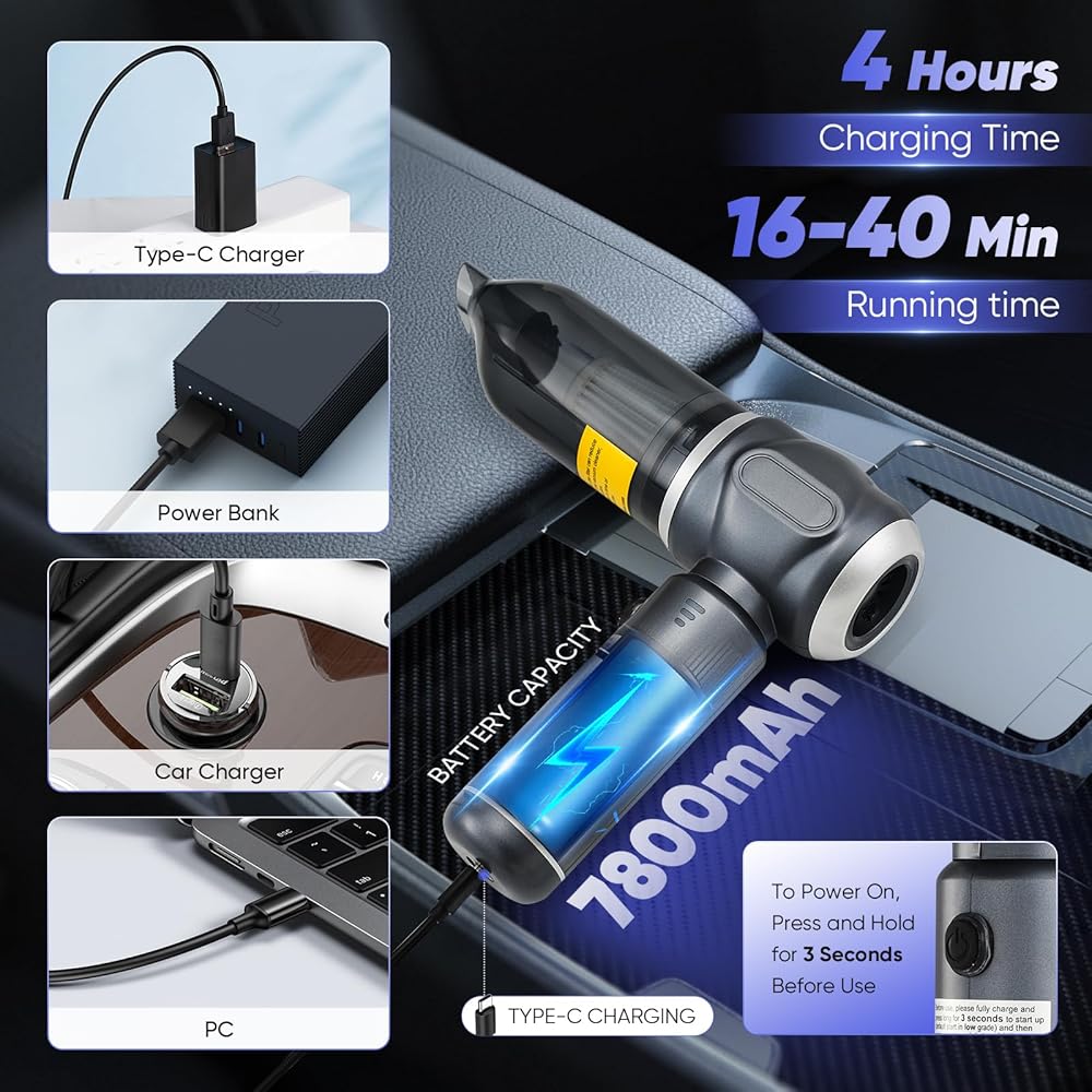 【POWERFUL BATTERY & LED INDICATOR】SakerPlus car vacuum portable cordless features a 7800mAh rechargeable battery, providing up to 40 minutes of runtime after a full charge (approximately 4 hours via USB Type-C). Once powered on, a green LED light will illuminate, indicating the device is ready for use. It offers three adjustable suction levels for efficient cleaning. Please note: this vacuum is not designed for liquid suction.