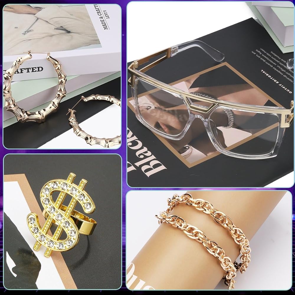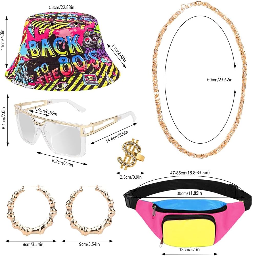 90s Package Includes:Includs 8 accessories, baseball jersey shirt x1, shorts x1, bucket hat x1, fanny pack x1, artificial gold rope chain x1, 80s 90s hip hop glasses x1, dollar ring x1 and 1 pair of earrings. This complete set and accessories is perfect for any '80s and' 90s themed party, making you stand out and express your hip hop style.