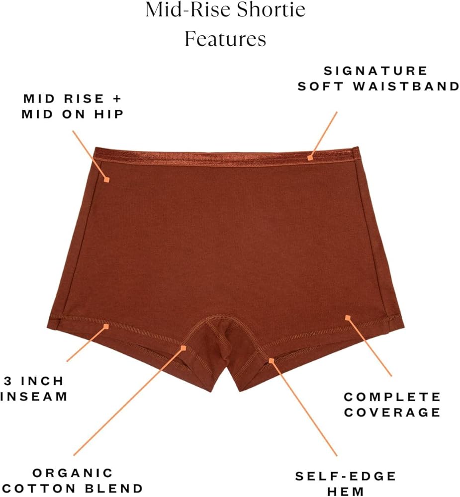 The Mid-Rise Shortie is where underwear meets loungewear. This boyshort style features a 3” inseam, super soft waistband and easy self-edge leg hem. The Mid-Rise Shortie boasts our fullest coverage in our signature organic cotton blend, making this style divine under dresses or for days spent entirely in bed.