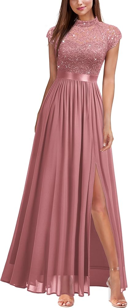 Delicate Sequin Lace Contrast Chiffon, Flattering Split Hem, A Line, Maxi Dress, Zipper up Back