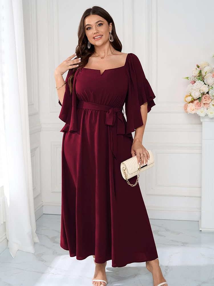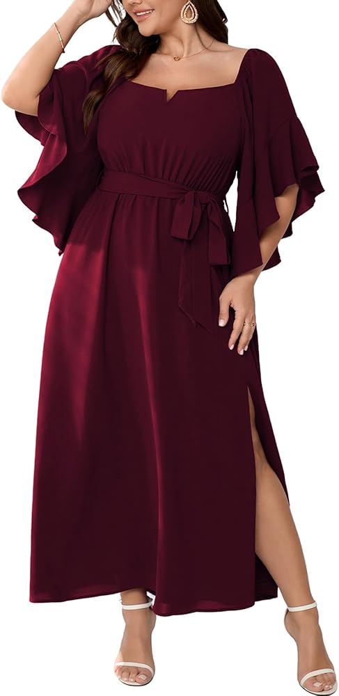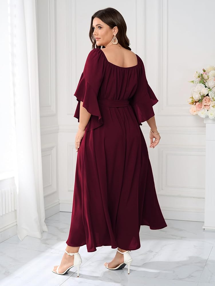 Unique Style: Plus size dresses for women feature flattering elastic 3/4 ruffle sleeves in an eye-catching and standout look, which can be styled as a noff-the-shoulder dress, the square neck is classic and timeless to show your beautiful neckline with a flattering v-cut design, and the high waist with side slit aline dress visually elongates the legs, creating a elegant and chic look