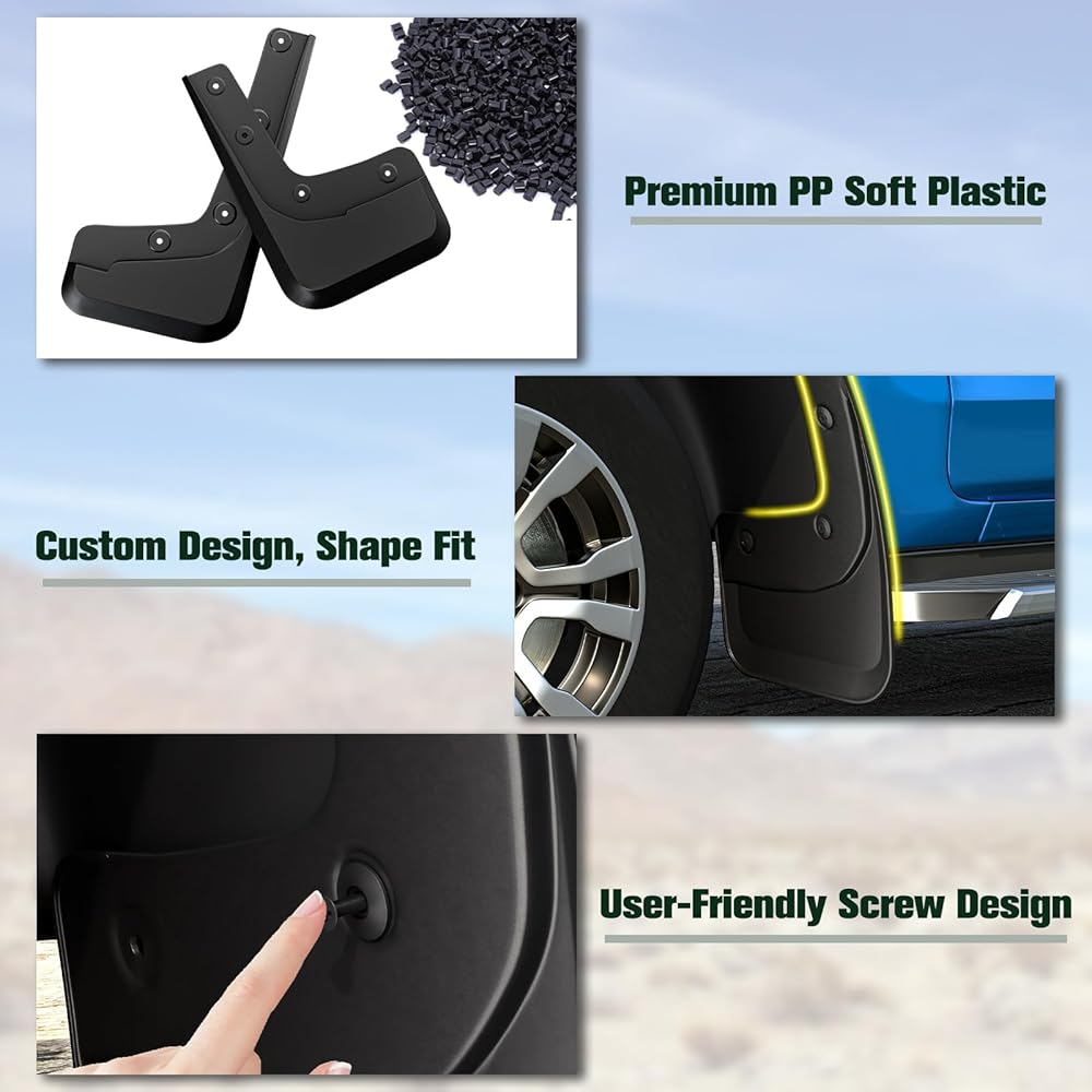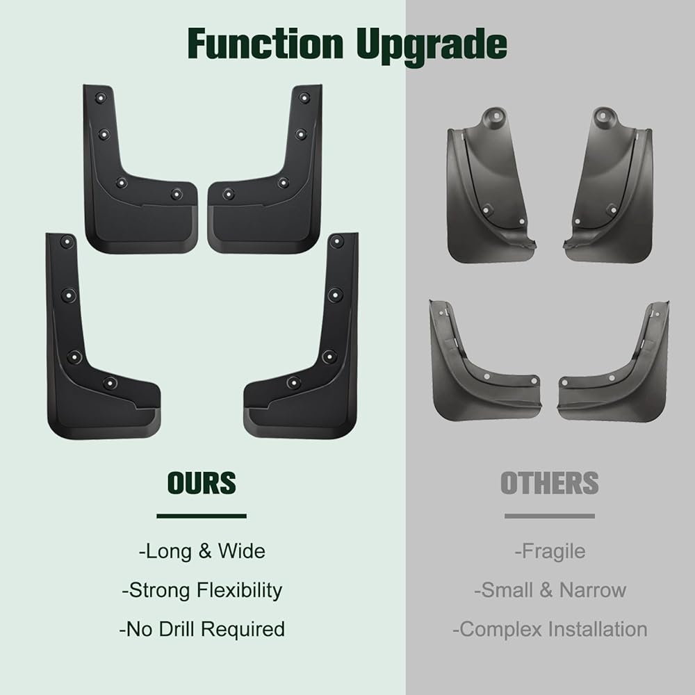 【Easy Installation, No Drilling Required】: Easily of use in mind, the installation process is simple and hassle-free. Each mud flap is clearly marked with installation directional identification, allowing you to easily snap them into place without the need for drilling. This straightforward setup saves you time and effort, making it perfect for you to install quickly and efficiently. (Please note: If your car is equipped with original factory rear side steps, excess plastic needs to be trimmed off during installation)