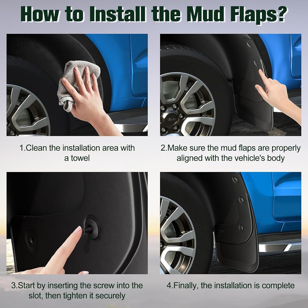 【Complete Accessory Kit, Everything You Need】: Each set of ford mud flap comes with a full set of installation accessories, including: 16 *screws; 4 *mudguards; 1 *screwdriver. Additionally, we've included a high-quality microfiber towel to help you clean any residue during installation, ensuring a seamless setup every time. All components are carefully chosen for quality and durability, so you can feel confident about their performance