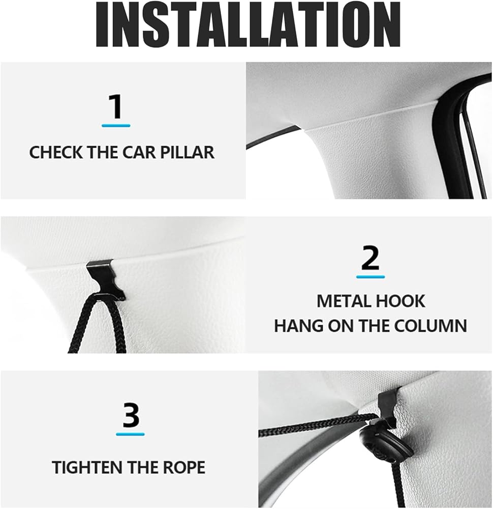 • [Easy to Install and Firmly Fixed] You just need to break the metal hook at a right angle and insert the metal hook into the gap of the car B-pillar or C-pillar, and then pull the drawstring tight, the curtain will be firmly fixed on the car window, not easy to fall off. Both installation and removal are very convenient and quick. Tip: metal hooks need to be broken straight by hand in order to insert the car pillar gap.