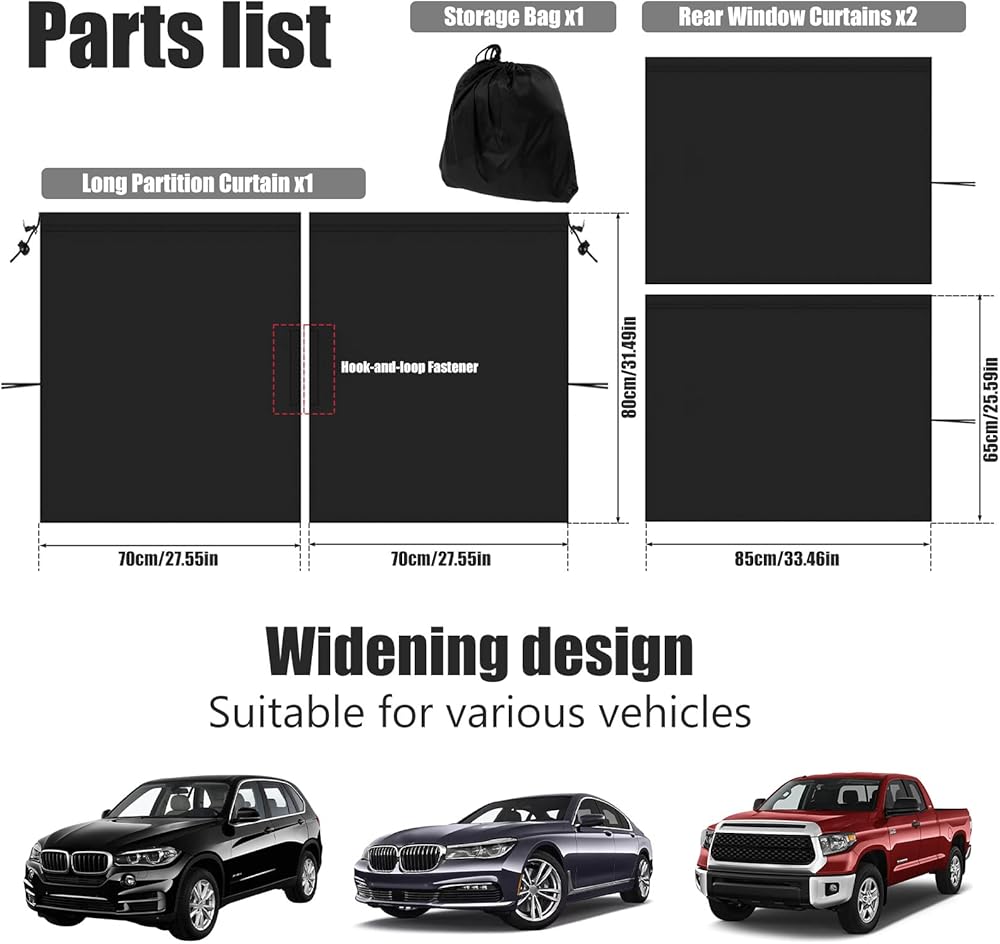 • [Universal Fits] Our products are available in 2 different specifications: 1 long rear seat divider curtain or 1 long rear seat partition curtain plus 2 rear seat side window curtains, you can choose according to your needs. Long partition curtain is 140 x 80 cm / 55.1 x 31.5 inch, and the size of two rear curtains is 65 x 85 cm / 25.6 x 33.5 inch, they have been widened, which is larger than ordinary curtains on the market, and can adapt to various cars, SUVs, pickup trucks and other models.