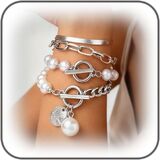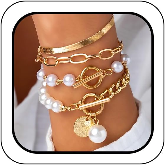 14K Gold OT Buckle Coin Pearl Paperclip Stacked Bracelet Set for Women, Statement Snake Pearl Paper Clip Bracelets Stack Dainty Prom Party Jewelry Gift