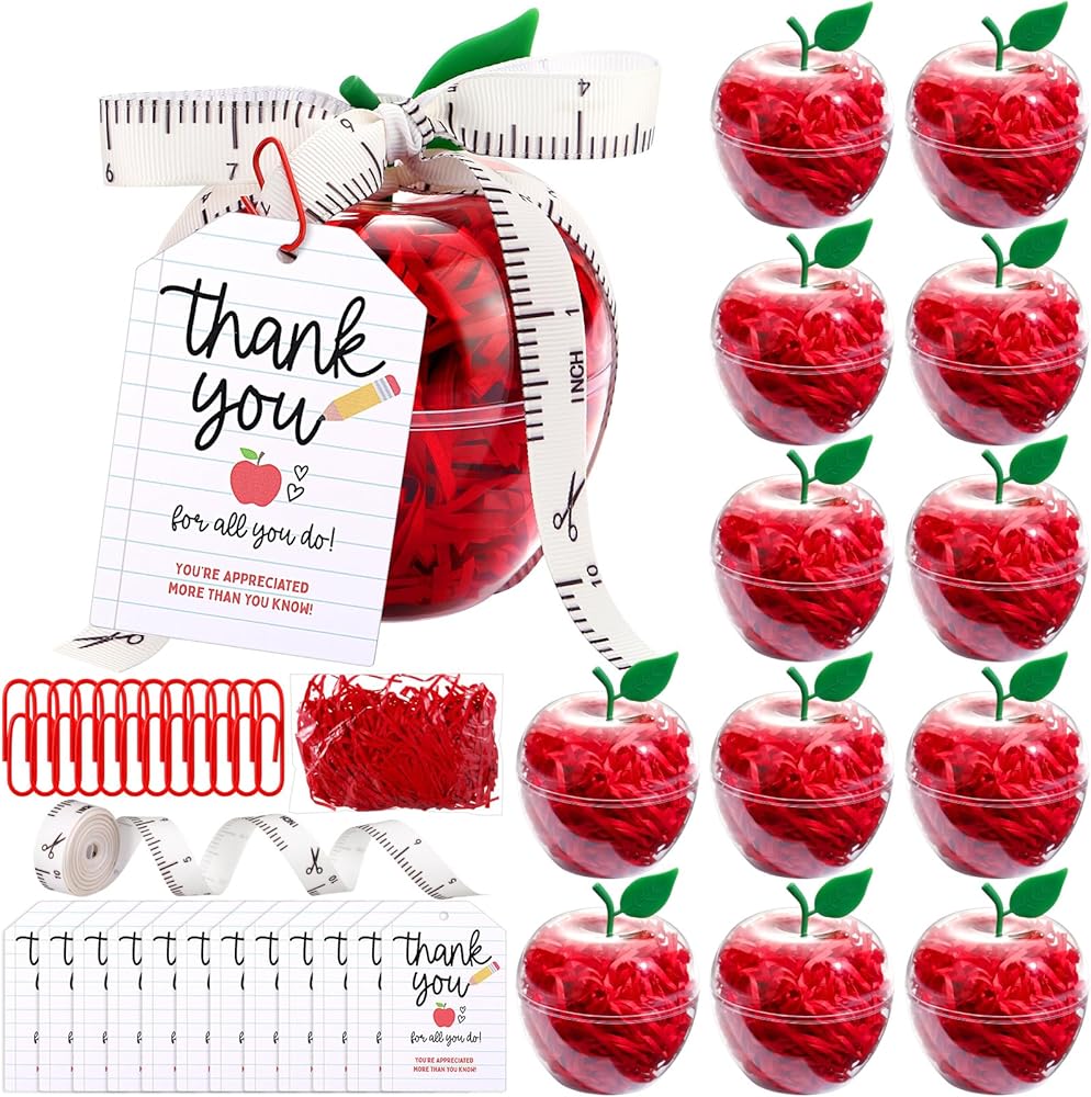 Packages Include: the sets includes 12 apple shaped plastic candy jars, 12 school year greeting card and paper clips, comes with ribbon and raffia, ideal for filling with sweets, small notes, or gift cards, making them a thoughtful teacher appreciation gift; Show your gratitude to teachers with these charming apple containers, nice for teacher appreciation gifts or party apple decorations