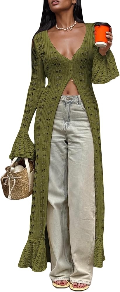 Features:wide long bell sleeve,button-up,ruffle ribbed hem,solid color,relaxed fit,floor length,crochet knit long sweater dress,flowy hollow out kintted cover up coat,oversized cardigan,boho chunky cardigan,deep v-neck,see-through mesh sheer cardigan