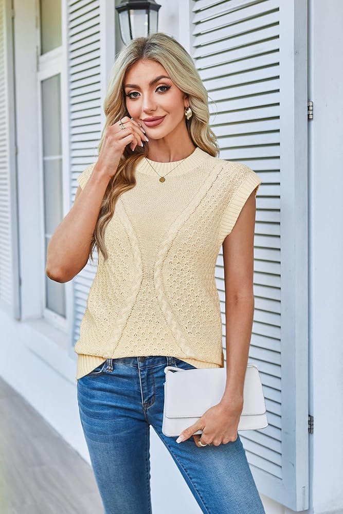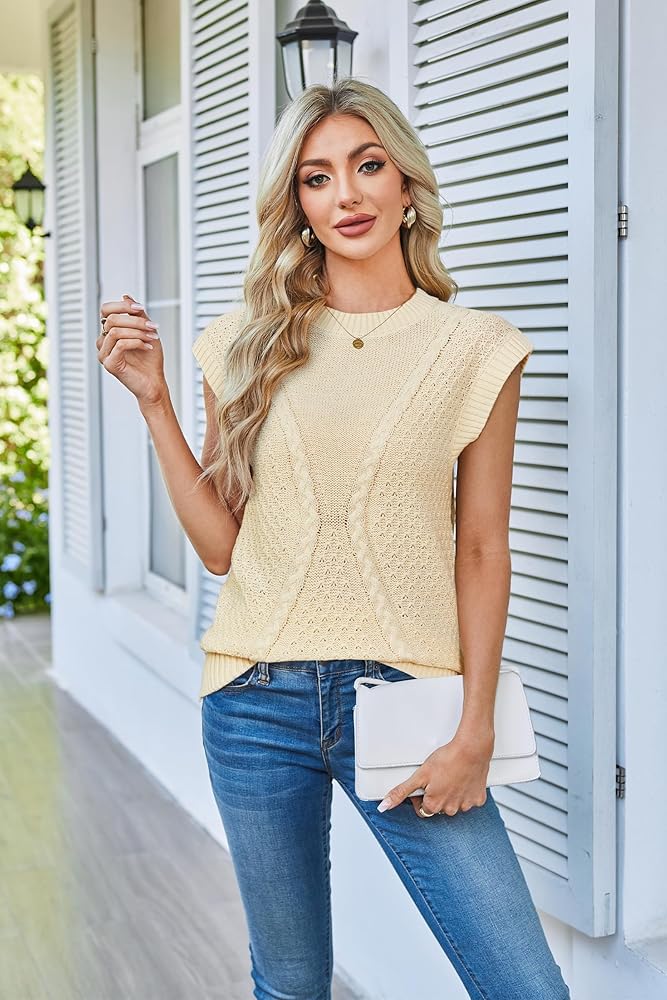 Arach&Cloz Womens Spring Sweater Vest 2025 Cap Sleeve Crew Neck Casual Tops Cable Knit Crochet Loose Fit Summer Outfits