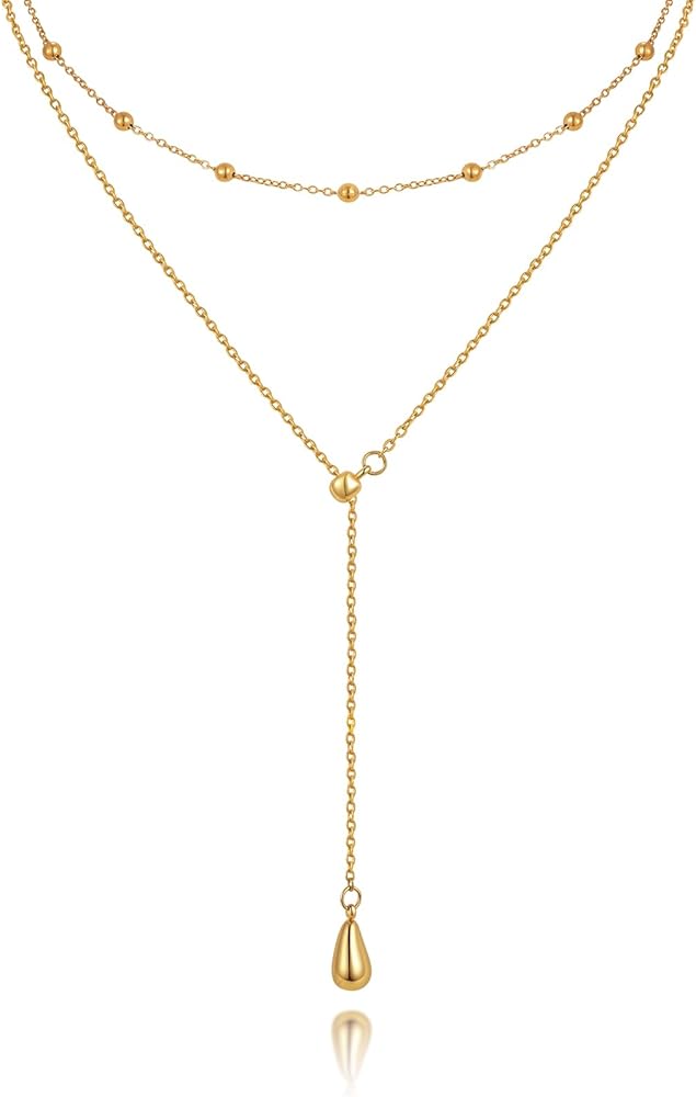 Lariat Gold Necklaces for Women - 18k Gold Plated Long Necklace,Y-Shaped Choker Simple Necklace Layered Beaded Chain Drop Necklace Trendy Jewelry Hypoallergenic,Valentine Day Wedding Prom Gift For Her