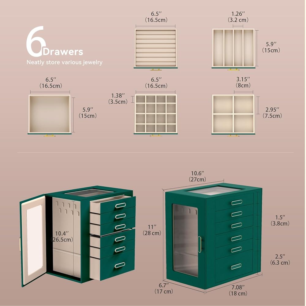 Jewelry Boxes for Women, 6 Layer Jewelry Organizer with Glass Lids, Jewelry Holder Organizer with 5 Drawers and 2 Glass Doors for Jewelry Storage, Big Jewelry Box for Womens Gift (Green)