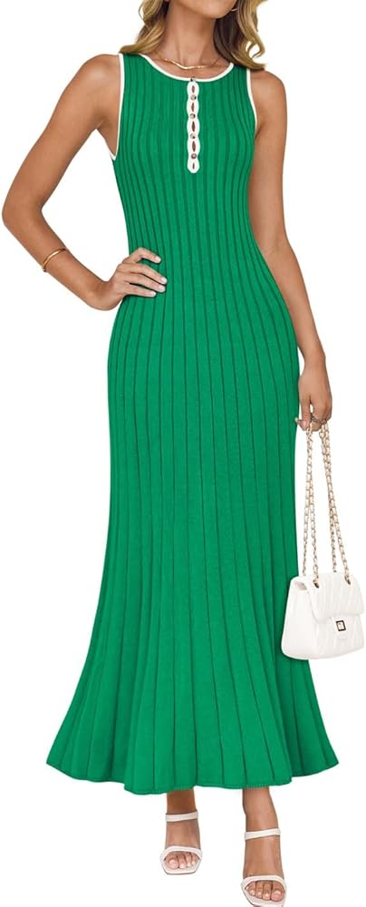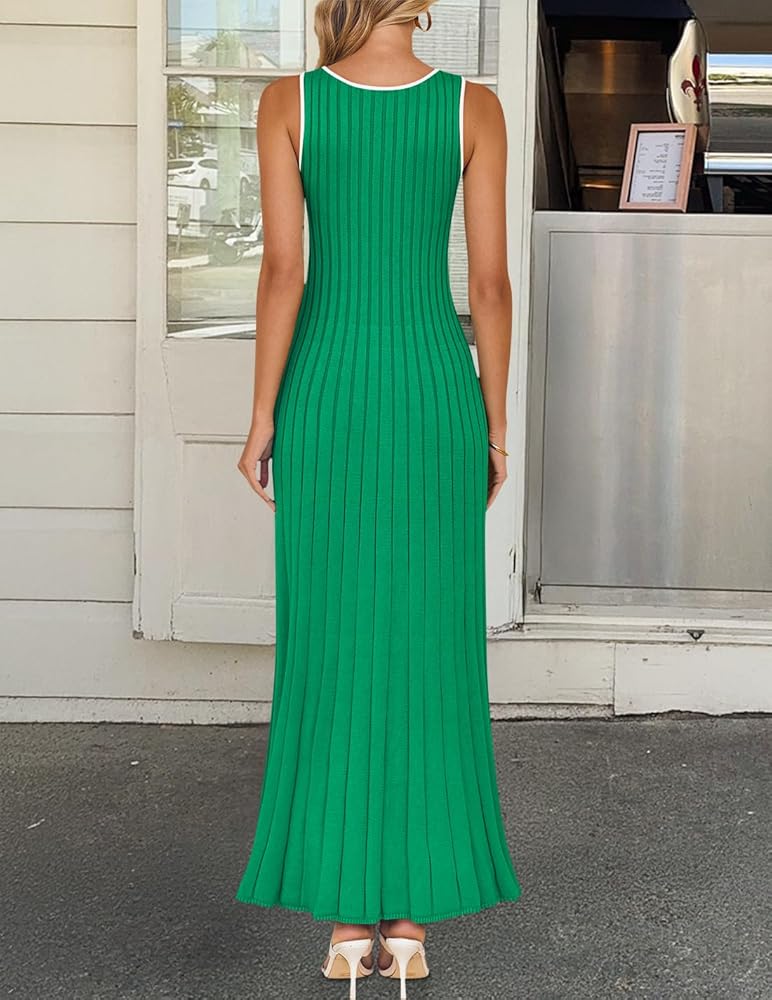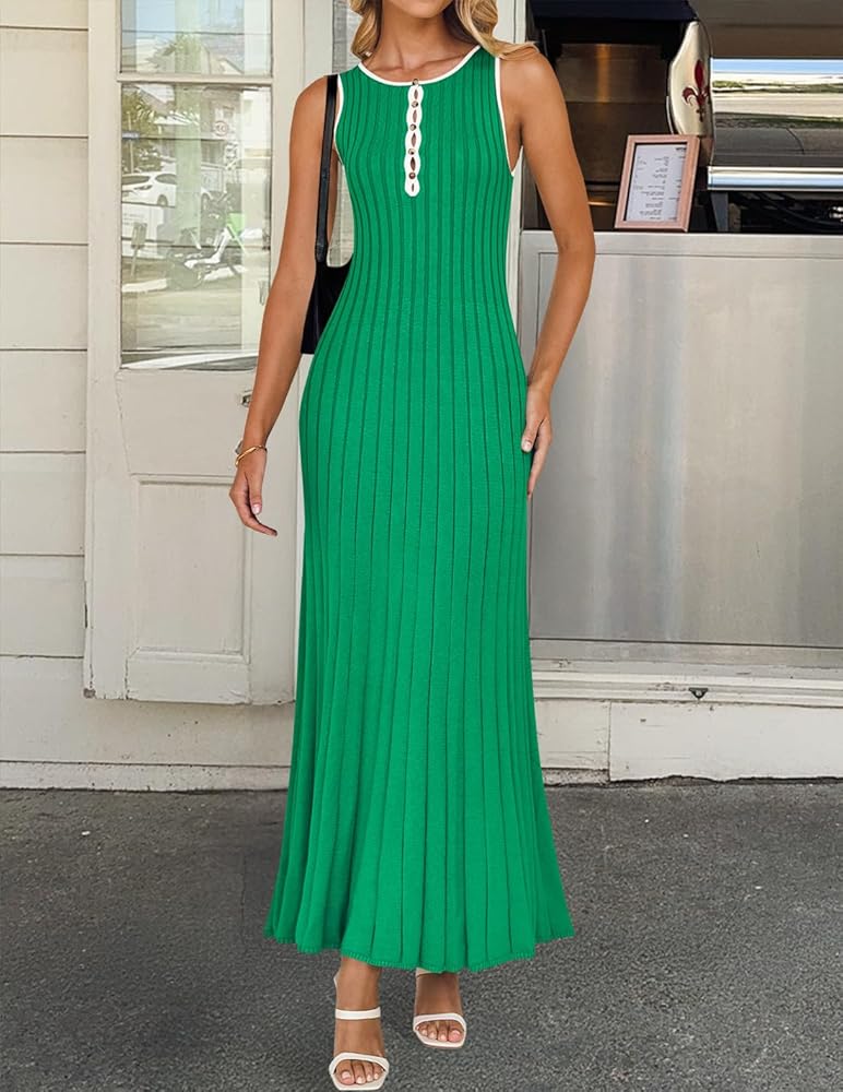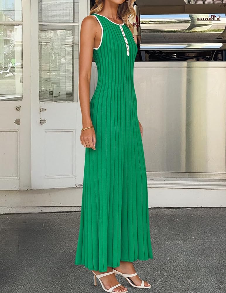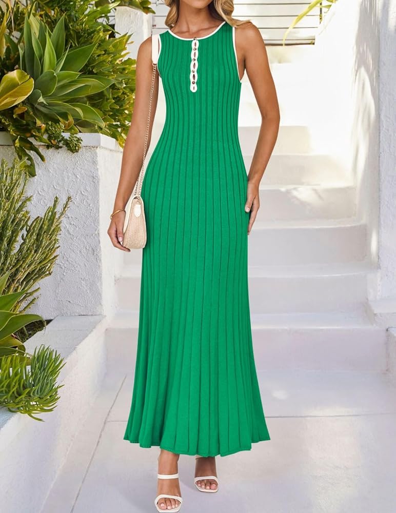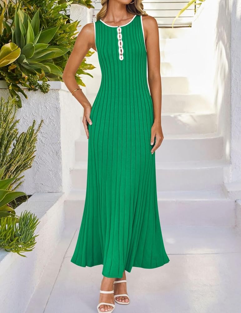 This flowy dress features a flattering crew neck and pleated detailing. Add a touch of elegance to your outfit with this womens sleeveless dress, crafted for comfort and style. The maxi length and ribbed knit texture make it a standout piece.