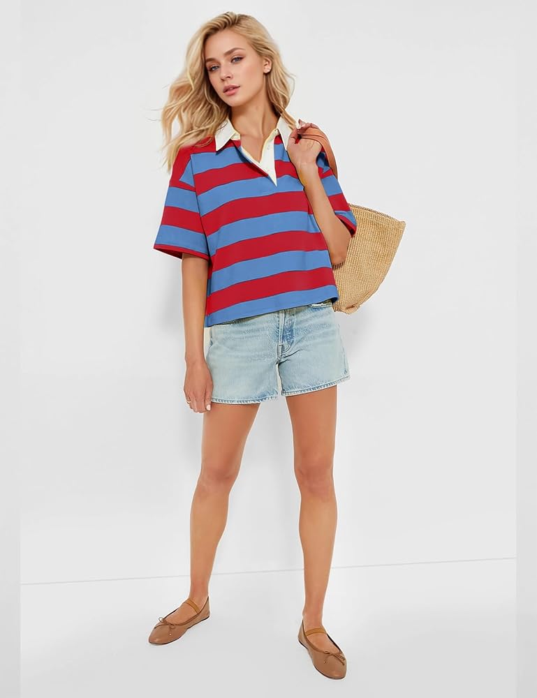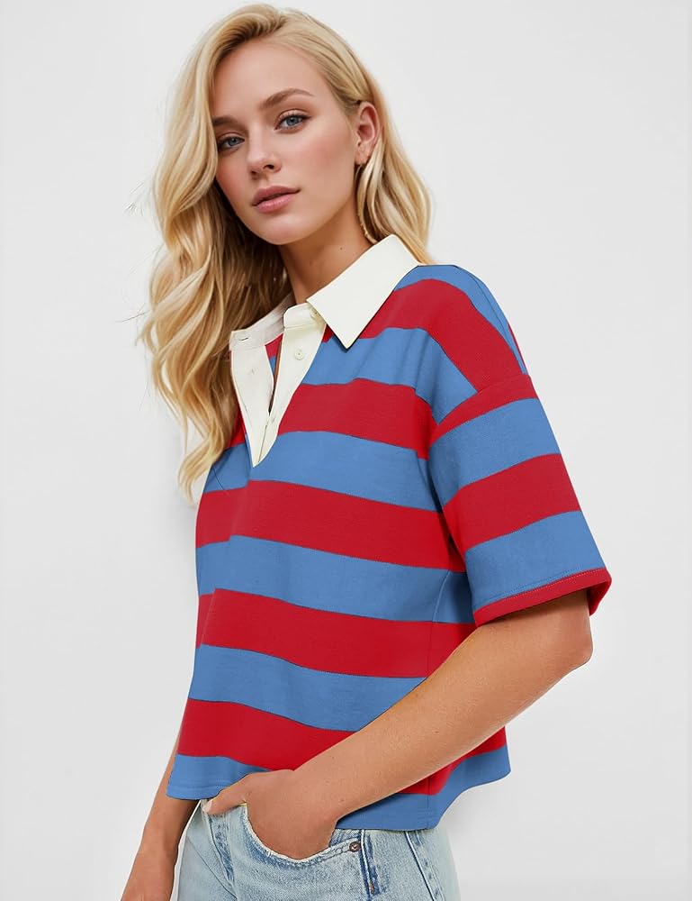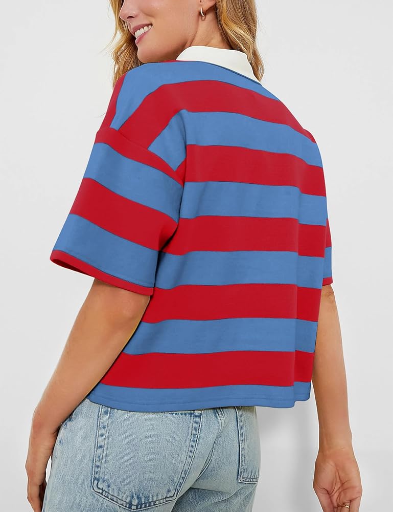 【Fashion Striped Design】The women polo striped shirt with classic vertical stripes in versatile colors feature a relaxed athletic cut with a collar and a buttoned placket for a polished appearance.