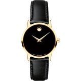 Women's Museum Classic watch, 28 mm yellow gold PVD-finished stainless steel case, black Museum dial with yellow gold-toned dot and hands, smooth black calfskin strap with yellow gold PVD-finished stainless steel buckle.
