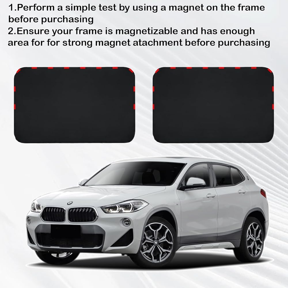 【Flexible Design】Our sunshade has upgraded the strong magnetic strip design, which can be adsorbed on the metal window frame in 3 seconds and removed without leaving any traces. If your vehicle uses an aluminum door frame, it cannot be magnetically adsorbed. Before purchasing, you need to confirm the material of the window. Note: Only suitable for metal window frames, not for carbon fiber and aluminum surfaces