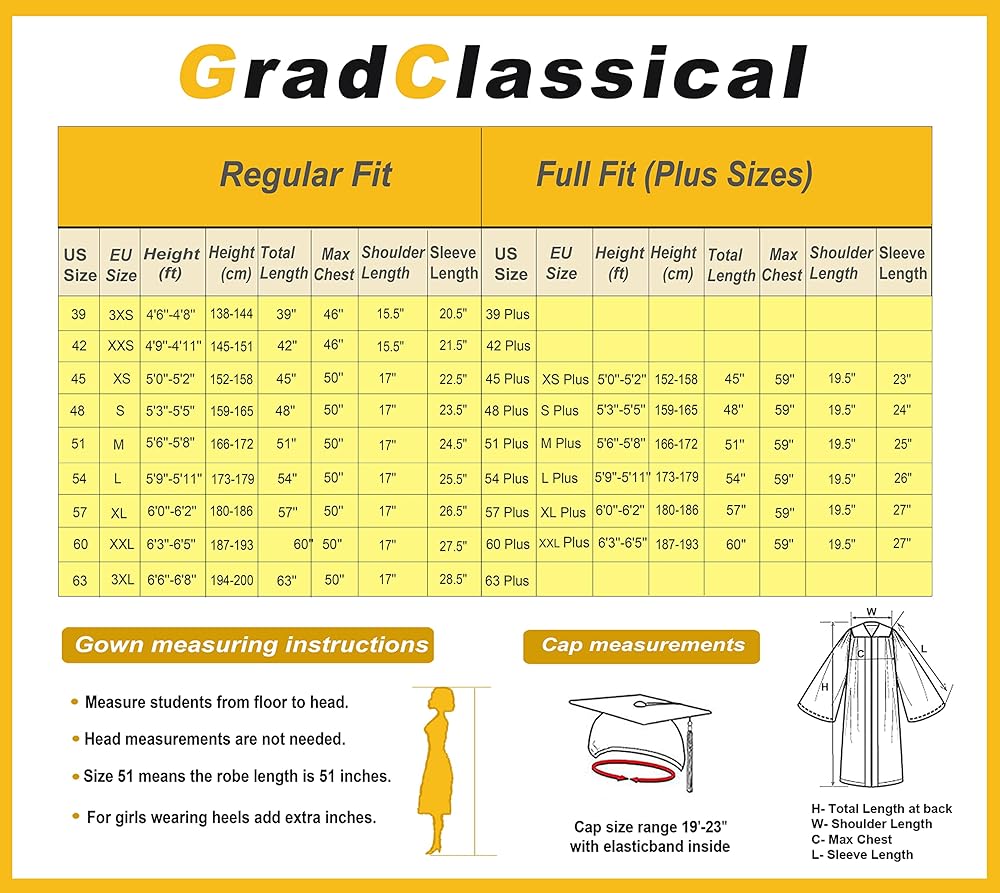Gown size: Robe length 48 inches, fits height from 5'3" to 5'5", max chest 50 inches.The robe bottom off the ground by 8"-16", around end by calf. If you like to ankle, please choose one or two sizes larger accordingly.