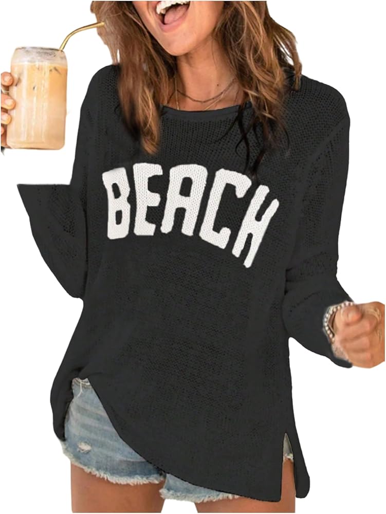 Features: Letter print, round neck, drop shoulder, long sleeve, split hem, loose fit, semi-sheer,swimsuit cover up for women, bikini cover up, casual pullover sweaters for women