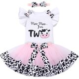 Cow 1st 2nd Birthday Romper 3rd Birthday Top: Kids baby cow outfit infant Halloween cow costume girl first second third birthday outfit cows, “Moo Moo I'm One”, "Moo Moo I'm Two", "Moo Moo I'm Three" cow “My 1st Birthday”, "My 2nd Birthday", "My 3rd Birthday", ruffle sleeves with two cow print bowknot. Farm animal party decorations for baby girl's toddler one two three year old 1st 2nd 3rd birthday smash cake pictures, cow cosplay dress up. Princess cow costume;