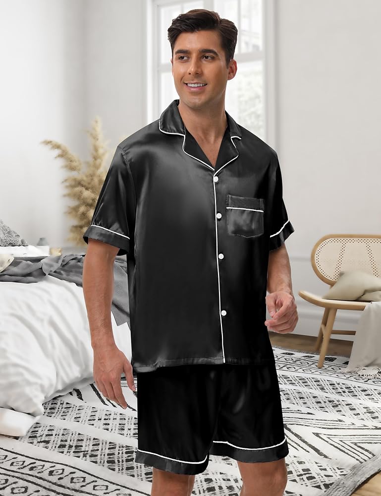 Timeless Style with Functional Ease: Featuring a tailored V-neck button-down shirt, classic notch collar, and a smart chest pocket, this mens silk pajama set blends elegance with daily wearability. The shorts feature an elastic waistband that adapts effortlessly—satin pajamas for men who value both comfort and class