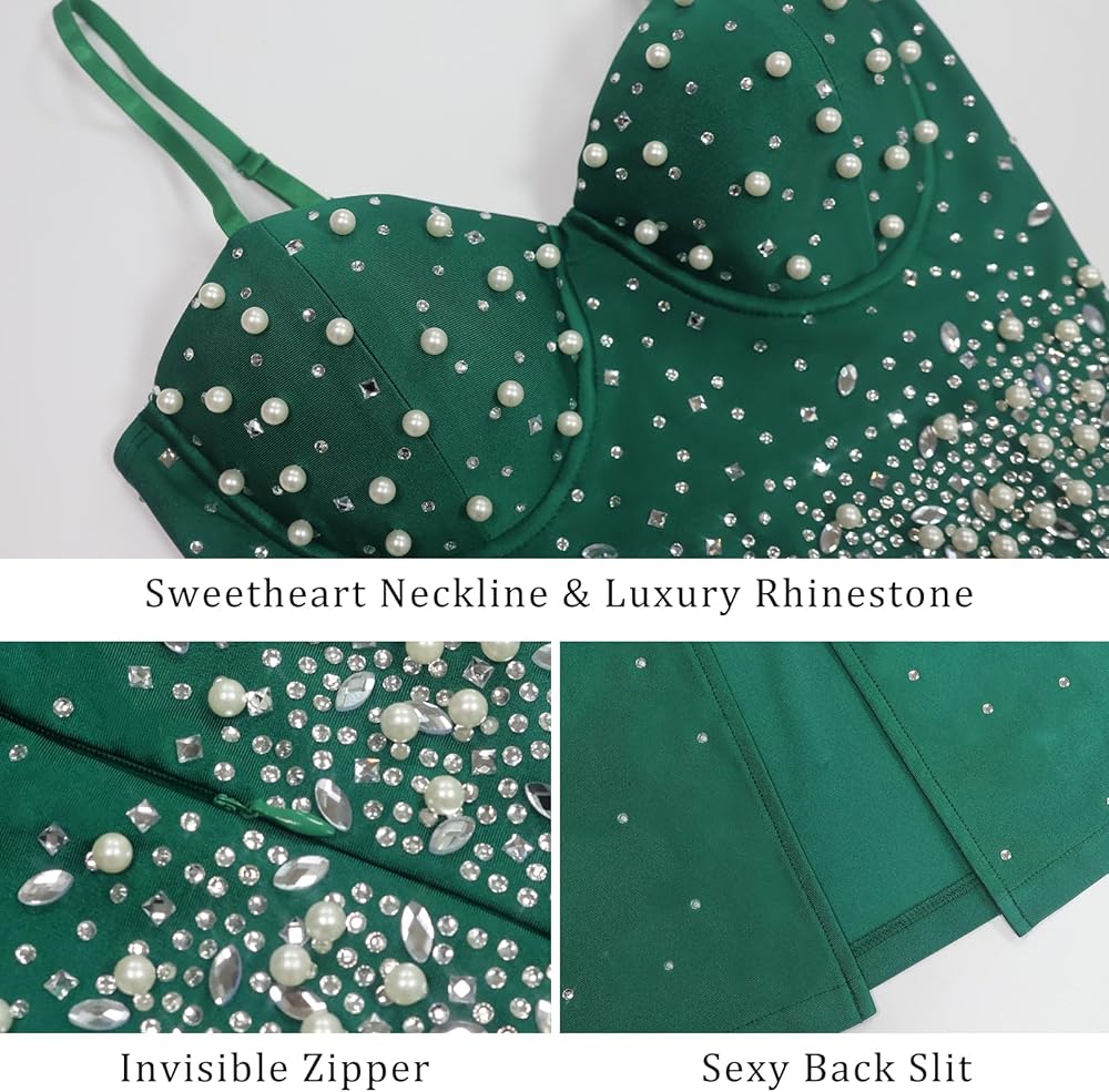 Unique Design:Women's sexy elegant dress with rhinestones and pearls embellished at the waist ,bra and throughout the skirt make this rhinestone dress look even more stylish! Adjustable spaghetti straps. Jelly non-slip edging around the inner lining of the bra to ensure more secure. Cocktail dresses for formal events. Invisible zipper for easy on and off and split for more sexiness and comfort.