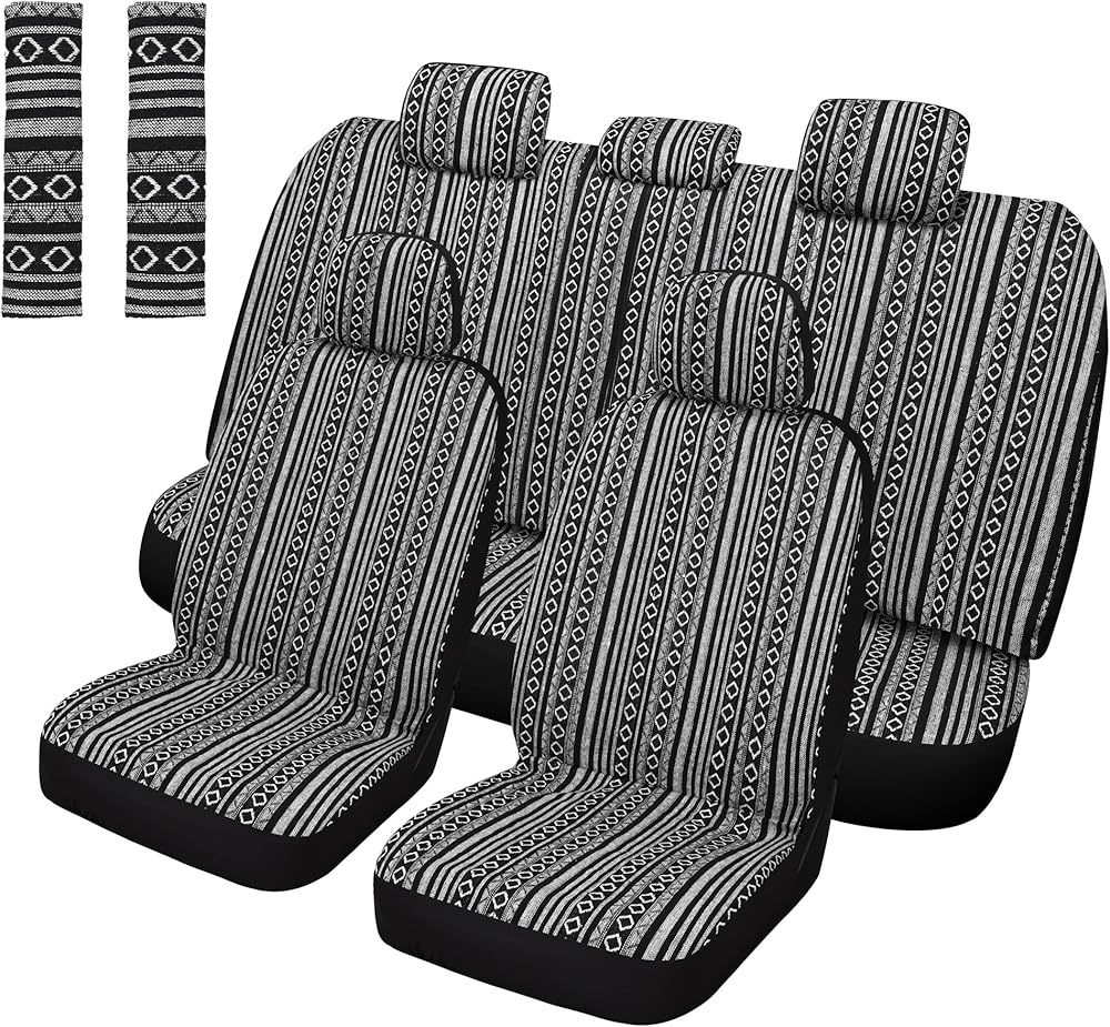 Pariitadin Baja Saddle Blanket Car Seat Covers Full Set with Seat Belt Pads, Washable Breathable Striped Woven Cloth Seat Covers for Cars, Universal Fit Most Cars, Airbag Compatible, Black/White
